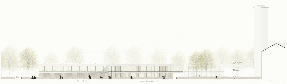 Vorgeschlagen wird, die Erweiterung der Schulanlage mit Sporthalle so zu positionieren, dass das Bestandsgebäude baulich weiterhin eigenständig im Stadtraum verankert bleibt.