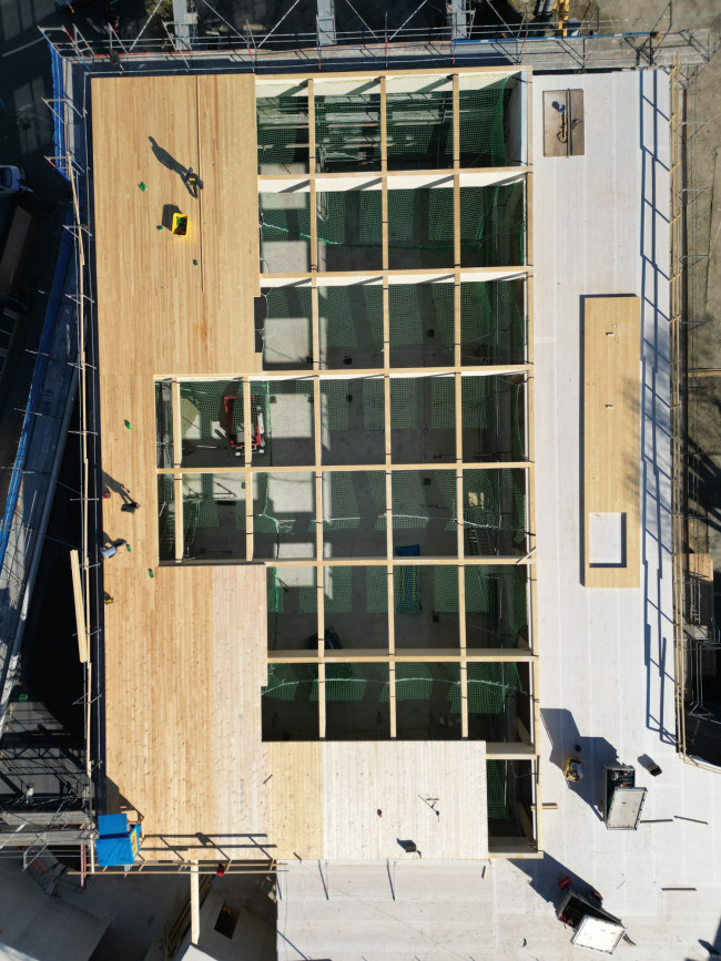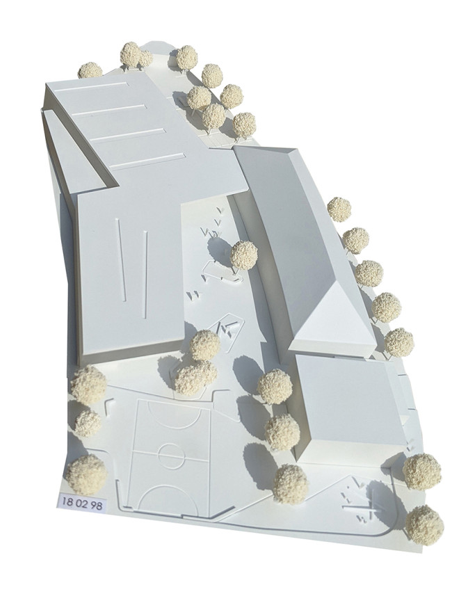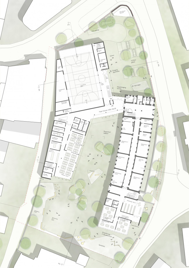 Im nördlichen Grundstück im Bereich des Vorhofes, wird die neue Sporthalle positioniert, dadurch bleibt der Vorhof mit seinen Bestandsbäumen großzügig erhalten. Die Sporthalle ist in ihrer Nutzung unabhängig von der Schule. Im täglichen Schulbetrieb wird sie in beiden Geschossen geöffnet und in den Schulbetrieb integriert.
