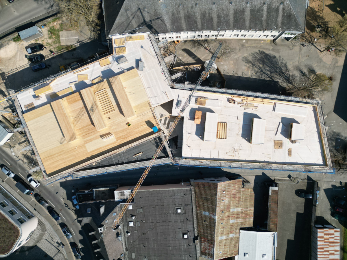 In einem ersten Bauabschnitt entsteht der Neubau der Sporthalle und der Mensa mit darüberliegendem Klassentrakt. Der Neubau nimmt stadträumlich die Drehbewegung der östlichen Baustruktur auf und wird im westlichen Bereich des Grundstücks platziert. Durch diese Positionierung entsteht eine Fuge zwischen Bestandsgebäude und Neubau. Hier liegt der neue barrierefreie Eingang mit großzügigem Vorplatz zum Schulcampus. Den Auftakt hierzu bildet ein verbindendes Element zwischen Neubau und Bestandsgebäude, das neue Foyer bzw. das „Herz der Schule“. Großzügige Vordächer bilden den notwendigen Witterungsschutz.