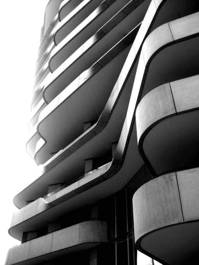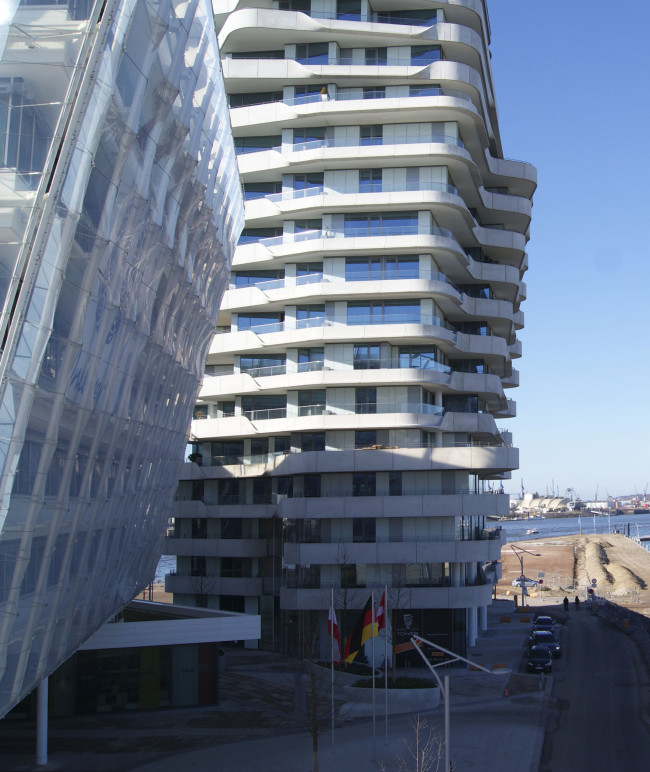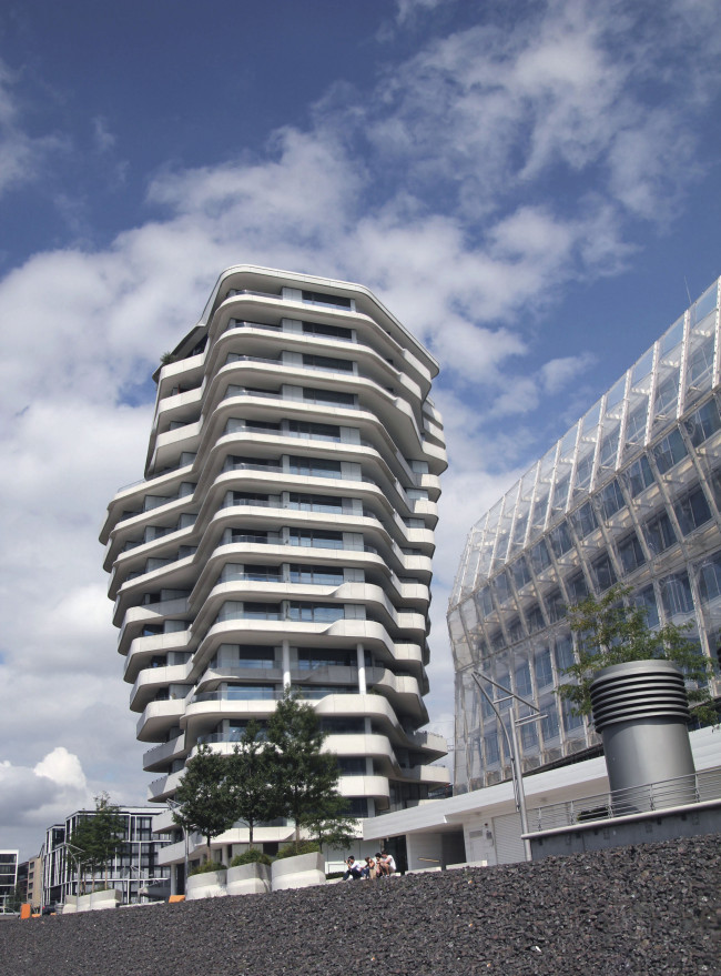 Die geschwungene und über die Geschosse wechselnde Grundrißform des Turms mit insgesamt 58 Wohneinheiten, hat einen Durchmesser von ca. 35 Metern und eine Höhe von ca. 60 Metern. Die Ansicht des Gebäudes wird durch umlaufende Balkone und deren teils massive, teils gläserne Brüstungen strukturiert. Die dahinter liegende Wohnungsfassade ist von der Brüstung abgelöst und wird in ihrer Führung vom Wohnungsgrundriss bestimmt. Eine besondere Herausforderung an die Fassaden stellen die hohen Windgeschwindigkeiten und damit die Wohnqualität in sämtlichen Geschossen dar.
