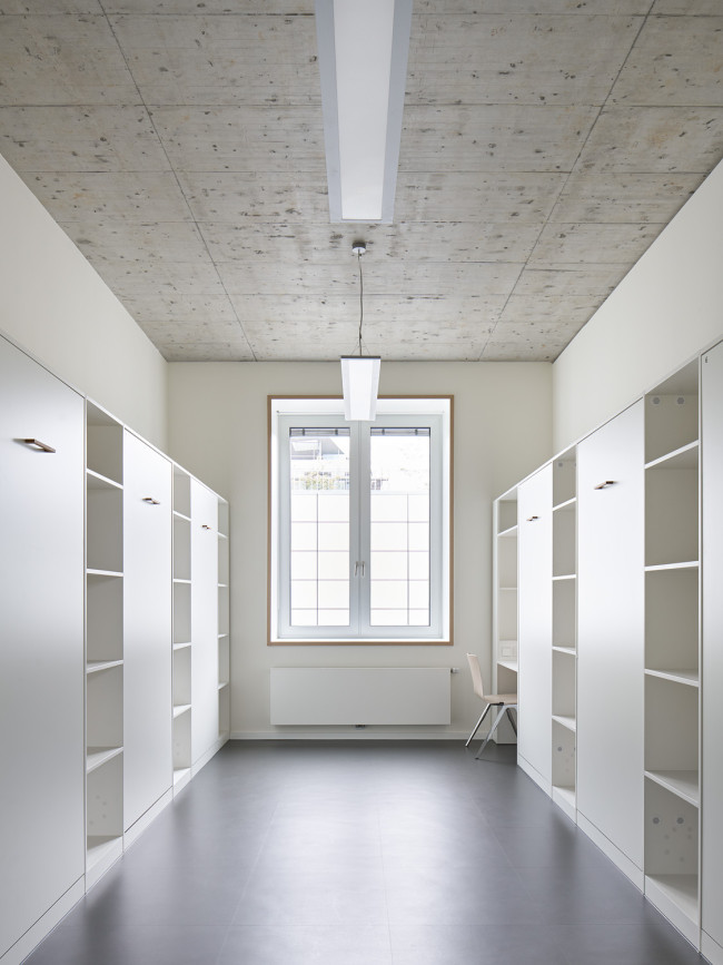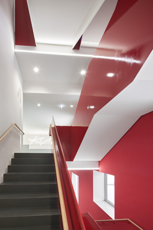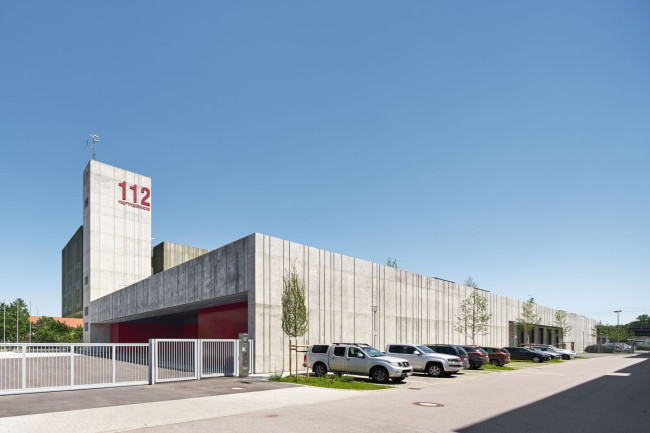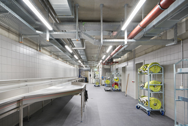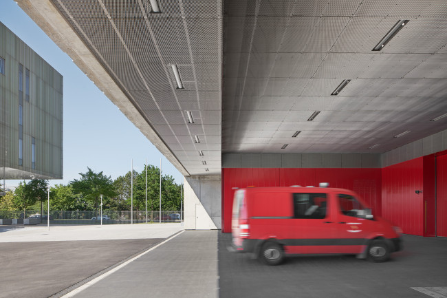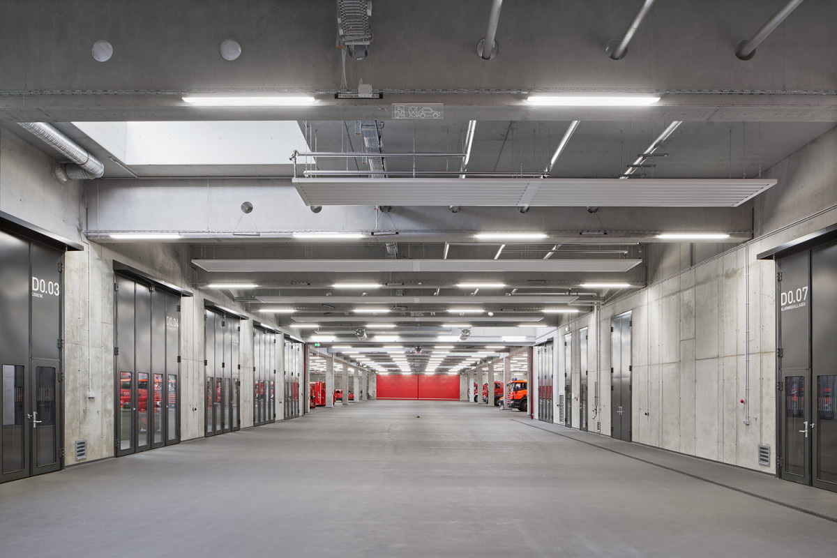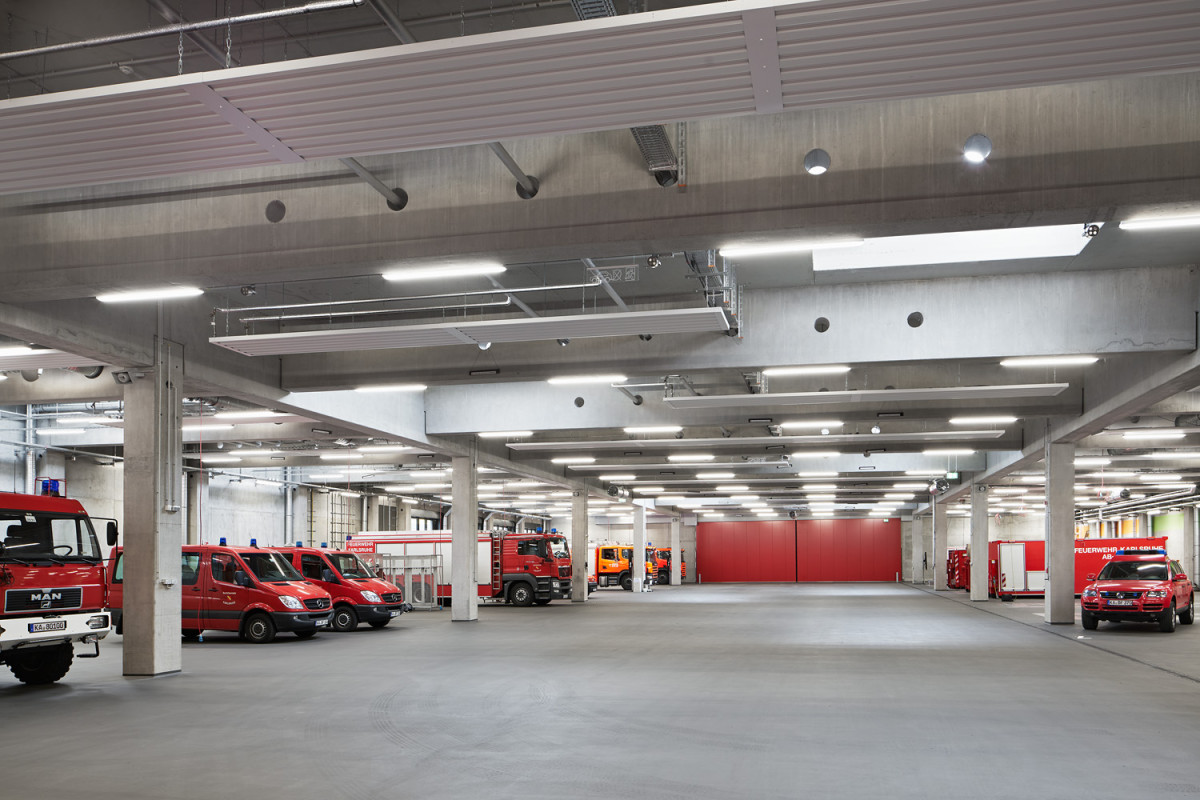 Wenn es alarmiert, muss es schnell gehen. Schon nach 60 bis 90 Sekunden rücken die Einsatzkräfte der Berufsfeuerwehr aus. Angesichts der Dimensionen der neuen Wache waren dementsprechend einige Überlegungen erforderlich, um die Wege kurz zu halten und auch Möglichkeiten zu schaffen, mit deren Hilfe die Stockwerke schnell überwunden werden können. Während die kurzen Wege in der Ebene durch die geschickte Raumaufteilung realisiert werden konnte, kommen zur Überwindung der Stockwerke die bewährten Sprungschachtanlagen zum Einsatz, die im Volksmund gerne als „Rutschstangen“ bezeichnet werden. Diese Sprungschachtanlagen sind gut sichtbar in den Treppenräumen untergebracht und verleihen diesen einen markanten Eindruck. Die Treppenräume selbst sind farblich markiert, um die Orientierung im Gebäude zu vereinfachen und die Laufwege zu strukturieren.