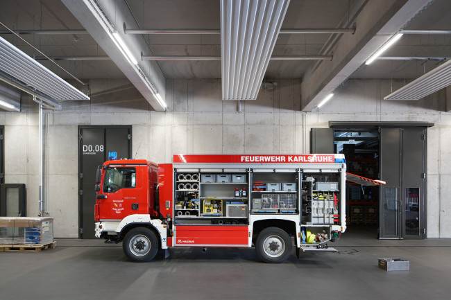 Zwei hintereinander geschaltete große Hallen beherbergen im Erdgeschoss alle wichtigen Funktionen. In der ersten großen Halle stehen die Feuerwehrfahrzeuge einsatzbereit, räumlich nahe der Signalausfahrt Wolfartsweierer Straße / Ostring. Die Feuerwehrfahrzeuge stehen zur raschen Ausfahrt rückwärts geparkt in der Halle. Zudem ist die Möglichkeit einer direkten Durchfahrt im Hallenbereich gewährleistet. In der zweiten großen Halle sind alle Funktionen untergebracht, um die Fahrzeuge einsatzbereit zu machen.