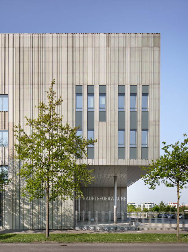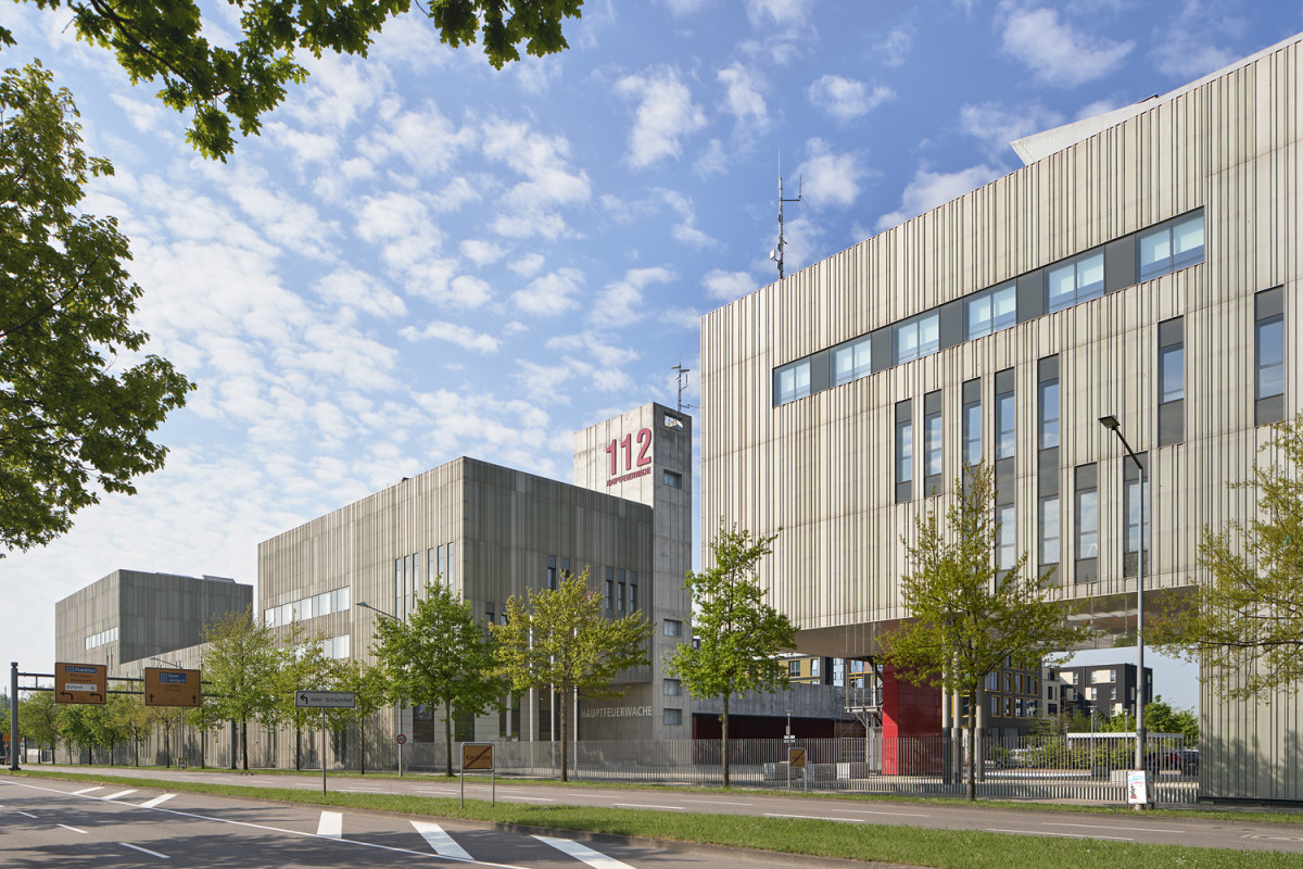Der Neubau der Hauptfeuerwache in Karlsruhe befindet sich stadträumlich an einer herausragenden Stelle. In Verlängerung der sich im Bau befindlichen integrierten Leitstelle, wird er markant entlang der Wolfartsweierer Straße, in einem eigenständigen bis zu 6-geschossigen Baukörper untergebracht und bildet mit der integrierten Leitstelle ein Ensemble. Über eine Platzfläche, welche sowohl das Vorfeld der integrierten Leitstelle als auch der neuen Hauptfeuerwache erschließt, erreicht man den Eingangsbereich des Gebäudes und den Zufahrtsbereich der Fahrzeughalle.