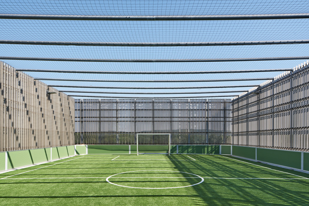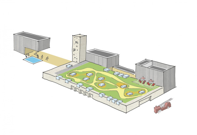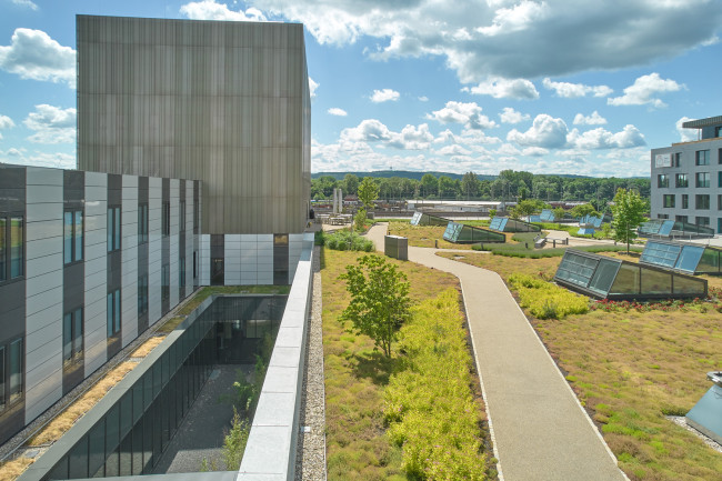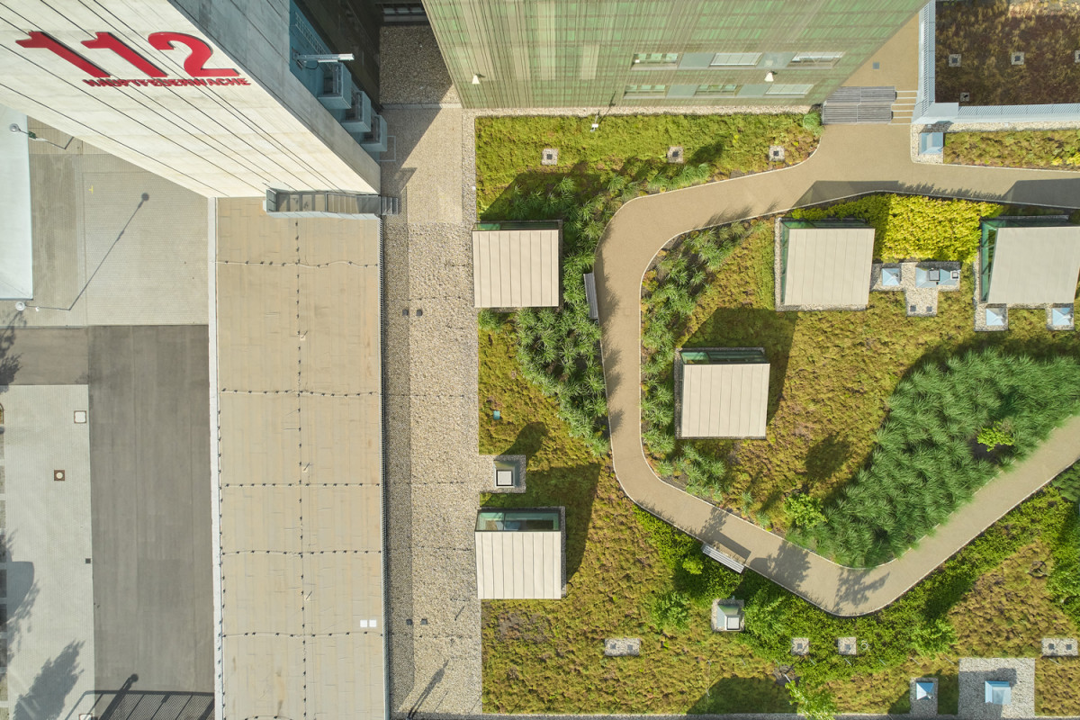 Auf der Fahrzeughalle entsteht eine circa 4.000 m² große Dachlandschaft, die für die Einsatzkräfte und Angestellten eine Rückzugs- beziehungsweise Erholungsfläche im Grünen bietet, aber auch im Hinblick auf die Ziele der Grünen Stadt einen wichtigen ökologischen und klimatischen Beitrag darstellt.
