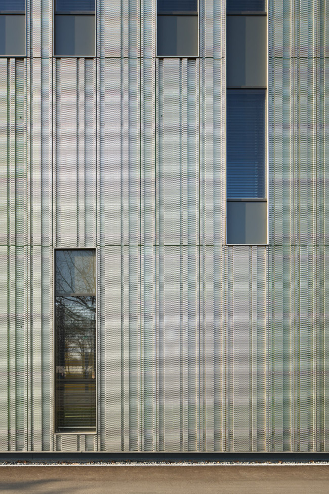 Eine wichtige Rolle spielt das Erscheinungsbild des Baukörpers und seiner Hülle an der Wolfartsweierer Straße. In Verbindung mit der integrierten Leitstelle soll ein homogenes Ganzes entstehen. Dazu wird die Fassadenstruktur der integrierten Leitstelle übernommen, welche es möglich macht, auf sämtliche inneren und äußeren Einflüsse wie zum Beispiel Belichtung, Belüftung, Schallschutz, Witterungsschutz, Sonnenschutz, Sicherheit und Behaglichkeit flexibel zu reagieren, ohne dabei ihren ausgewogenen Charakter zu verlieren. Die Kubatur der Gebäude wirkt als Schallbarriere, die perforierte Metallhaut fungiert als schallschluckende Wand. Die Fassade des Hallengebäudes und des Schlauchturmes wird in monolithischem Leichtbeton ausgeführt. Sie wird mit reliefierter Oberfläche - ähnlich der gekanteten Metallfassade des Riegelbauwerkes, vorgesehen, um die Gebäudeteile zu verbinden.