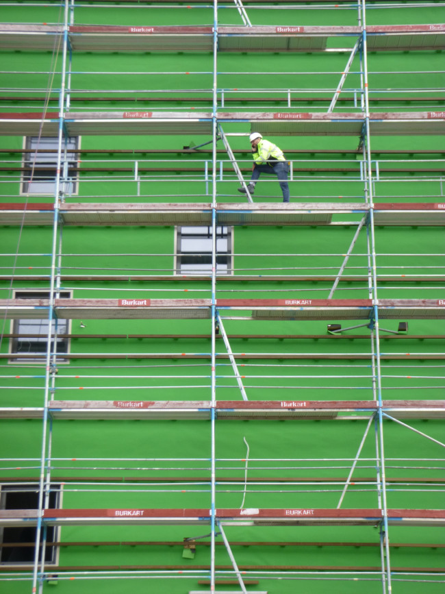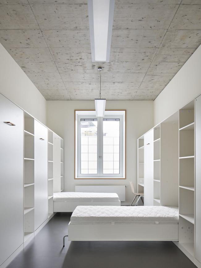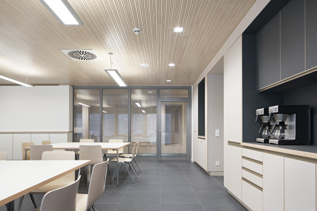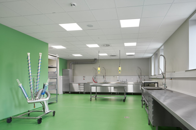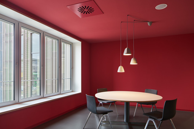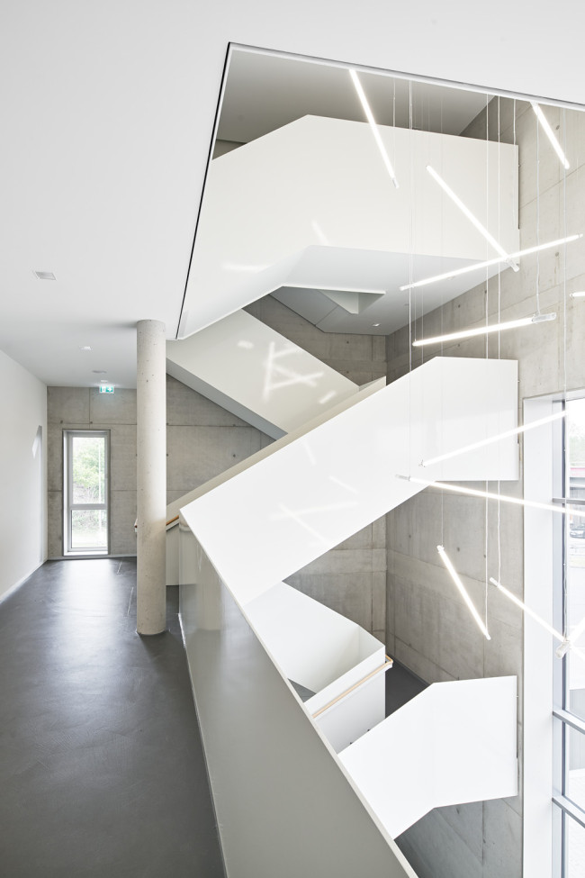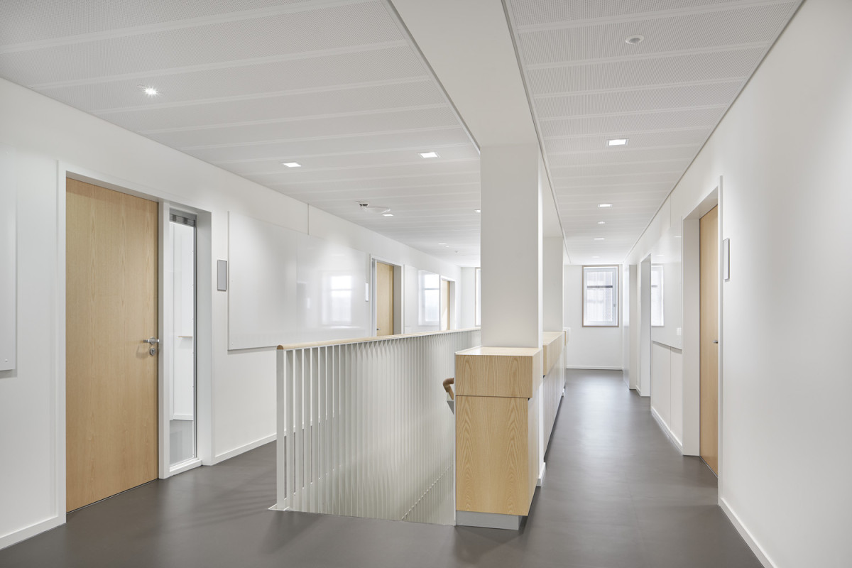 Sämtliche Werkstätten und Aufenthaltsbereiche sowie die Ruheräume gruppieren sich um einen dreigeschossigen Lichthof, dieser transportiert Tageslicht in die Flure und Räume und schafft Orientierung im Gebäude.