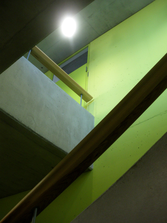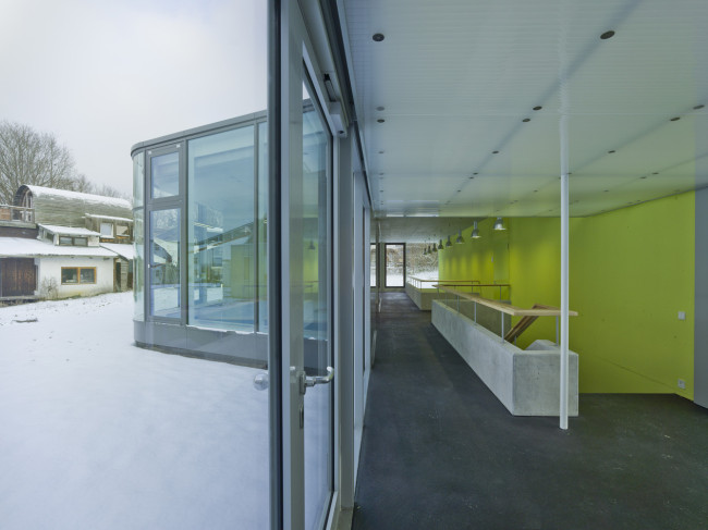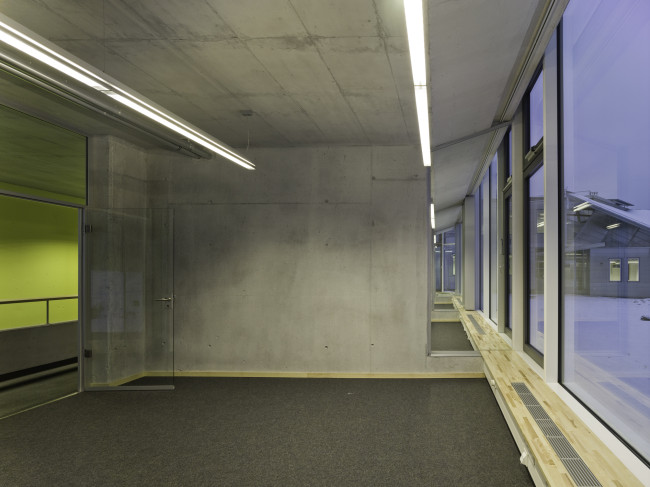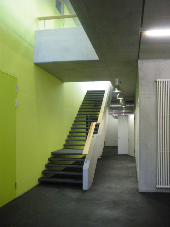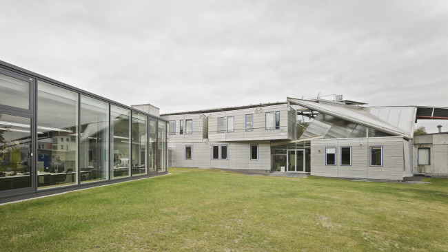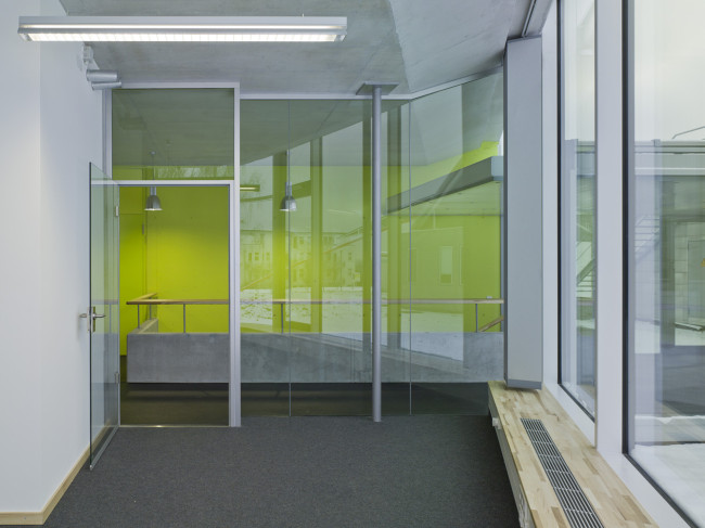 Auf der östlichen Seite des Bestandsgebäudes lagert sich die Erweiterung an. Niveaugleich liegen tagesbelichtete Büroarbeitsplätze, ein Seminarraum und eine zweigeschossige Halle, die den Eingang für das Tiefgeschoß beschreibt. Die behindertengerechte Erschließung wird durch einen Personenaufzug gewährleistet.