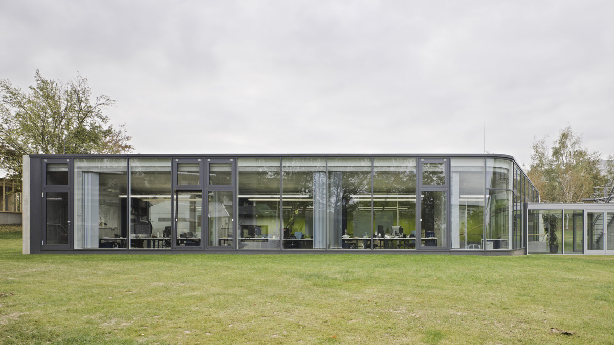 Die geforderte Nutzung kam der Aufgabenstellung dabei sehr entgegen.Das Visualisierungslabor unterliegt einem strengen Klimakonzept, das durch die auftretende Abwärme der Rechnerleistungen besonders empfindlich ist. Es wurde ein unter der Erde liegendes, zweigeschossiges Raumkonzept entwickelt, das die inneren Anforderungen optimal umsetzt und gleichzeitig in ein gleichmäßiges Temperaturumfeld eingebettet ist. Die Verbindung zum Bestandsgebäude ist erdgeschossig lediglich durch einen gläsernen Verbindungsgang hergestellt.