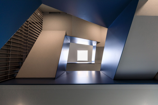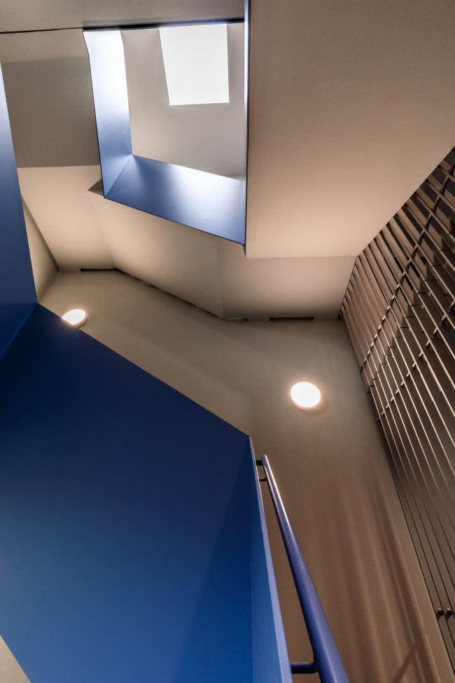 Das Treppenhaus wurde farblich akzentuiert. Großzügige blaugefärbte Oberflächen in unterschiedlichen Tönungen akzentuieren die einzelnen Geschosse und dienen als Orientierungssytem für die heterogenen Nutzungen.