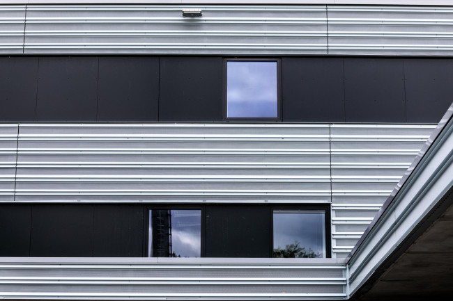 Die Fassade in Massivbauweise wurde aus Betonhalbfertigteilen erstellt. Je nach Grundrisssituation wurden große Fenster eingesetzt, mit einer Dreifachverglasung und einer zusätzlichen Scheibe, hinter der sich witterungsunabhängig der Sonnenschutz befindet. Die geschlossenen Fassadenelemente sind aus horizontal liegenden, industriell vorgefertigten Metallhalbfertigteilen montiert, die farblich behandelt wurden. Um den Gedanken des Stapelns aufrecht zu erhalten ist die Fassade konsequent horizontal entwickelt, mit Fensterbändern, welche aus der Grundrissfunktion heraus entwickelt wurden.