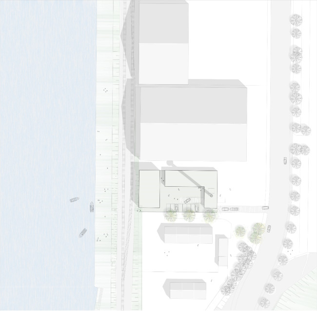Der Neubau orientiert sich südwestlich an der Wasserkante und verfügt über eine zentrale Erschließung, die durch diese Anordnung als Aufenthalts- und Kommunikationsfläche dienen kann. Die Eingangssituation ist klar definiert und der Wache angeschlossen.