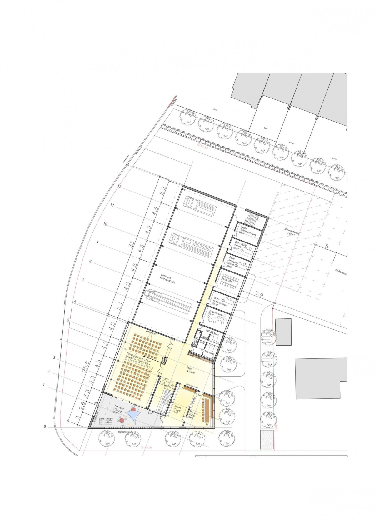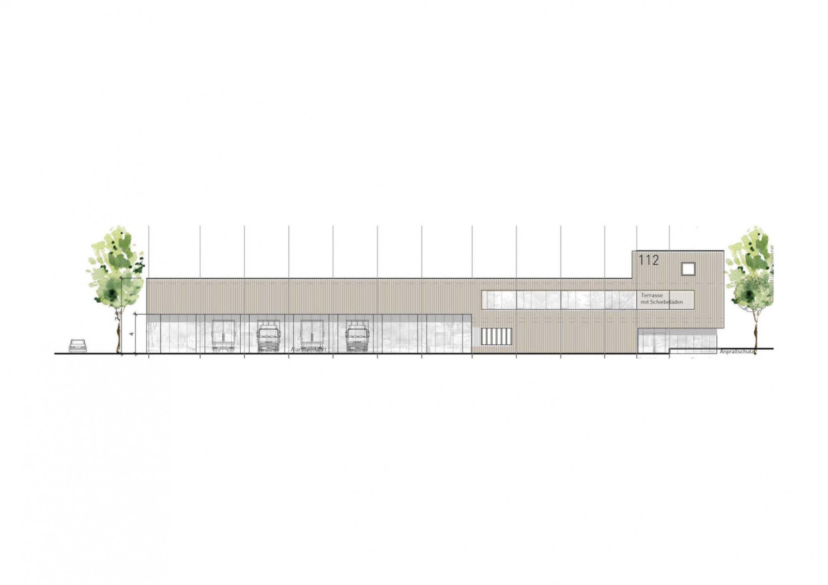 Die übrigen erdgeschossigen Bereiche wie Umkleiden, Sanitärbereiche, Werkstattflächen, sowie Lager- und Funktionsflächen sind in einem nordöstlich verlaufenden Längsbau untergebracht.