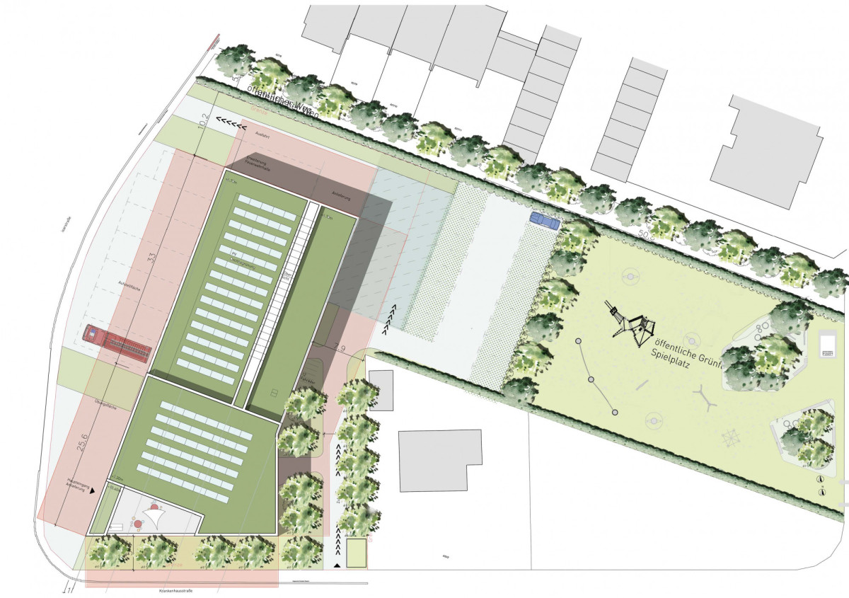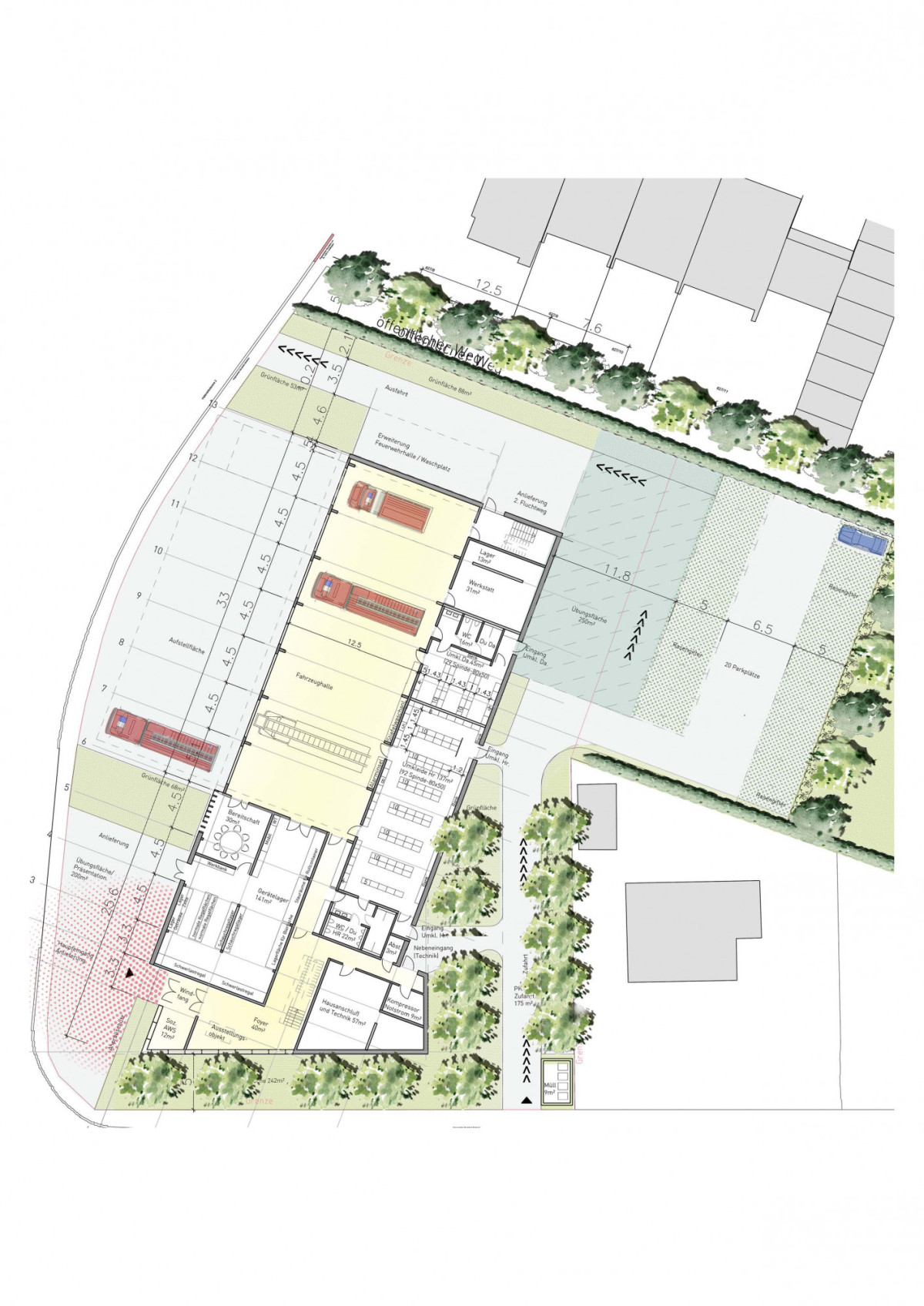 An der südwestlich gelegenen Straßenkreuzung ist markant der Haupteingang mit Übungswand und Übungsfläche platziert. Zum Schutz der Nachbarn wird die Fahrzeughalle mit Alarmausfahrt, kreuzungsfrei zu den weiteren Fahrzeugbewegungen, konsequent nach Westen zum Mittelbach mit Grünzug angeordnet.