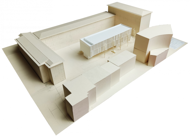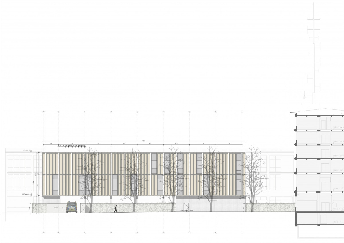 gegliedert. Die Fassade des Bestandsgebäudes besteht aus mineralischen Stoffen – massive vertikale Betonpfeiler mit