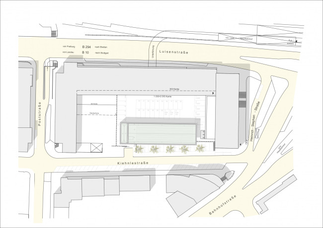 Der Neubau befindet sich im Stadtzentrum der Stadt Pforzheim und positioniert sich im Ensemble des denkmalgeschützten