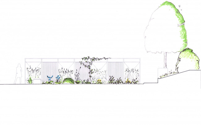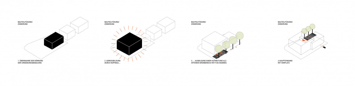 Das Gebäudevolumen gliedert sich entsprechend der nördlich angrenzenden Bebauung in ein Sockelgeschoss (UG) für Tiefgarage und Technik, sowie zwei zusätzliche Vollgeschosse im nördlichen Bauteil B und drei zusätzliche Vollgeschosse im südlichen Bauteil A. Die Bauteile erhalten begrünte Flachdächer. Die Zufahrt zum Parkgeschoss im UG erfolgt von Bischoff-Fischer-Straßenseite. Auf Nord-West Seite des Grundstücks entlang des Schützenwegs werden 3 Stellplätze für Besucher vorgesehen. Von dort gelangt man fußläufig über einen kleinen Vorplatz den überdachten Haupt-Eingangsbereich im Erdgeschoss. Im Verteilerfoyer schließt das Haupttreppenhaus mit Aufzug an und ermöglicht die Vertikale Erschließung.