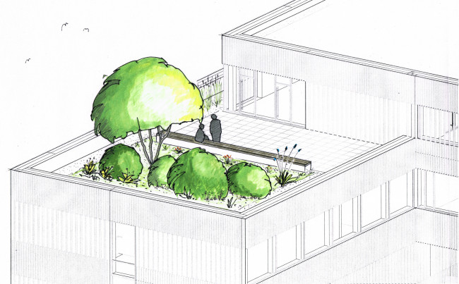 Im 2. Obergeschoss sind die Räume für den Stabsfall konzipiert.. Dem Stabsraum vorgelagert ist eine Dachterrasse mit intensiv begrünten Bereichen.