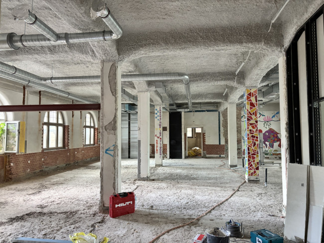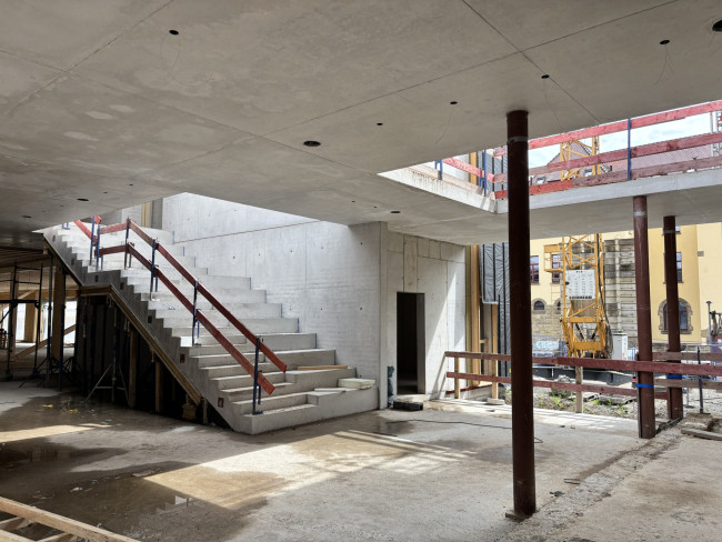 Der Eingangsbereich fungiert als künftiger Verteiler, eine neue großzügige offene Treppe verbindet das obere Geschoss von Alt- und Neubau.
