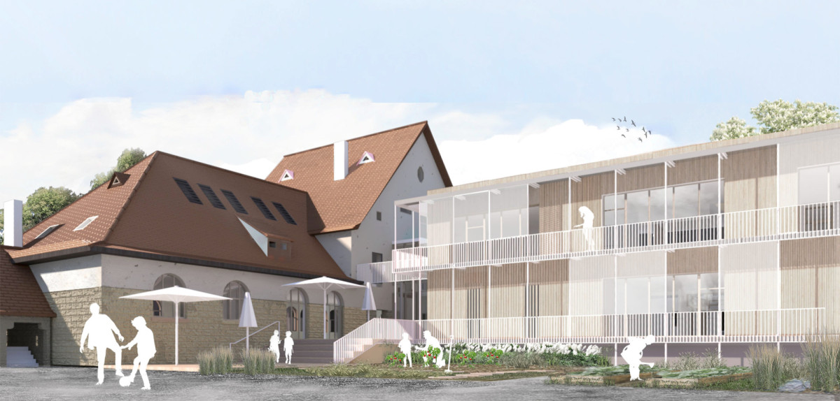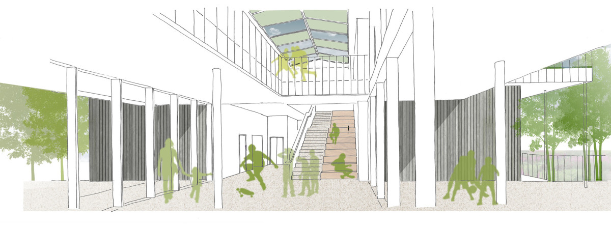 Der Erweiterungsbau soll sich wie eine Laube in die kräftige, denkmalgeschützte Randbebauung einfügen. Er zeigt sich vorwiegend in Holzbauweise. Die Fluchtbalkone sind nicht nur Fluchtbalkone, sondern bilden die zweite Schicht der neuen Lernlandschaft. Sie wirken wie ein Schutzraum und Filter.