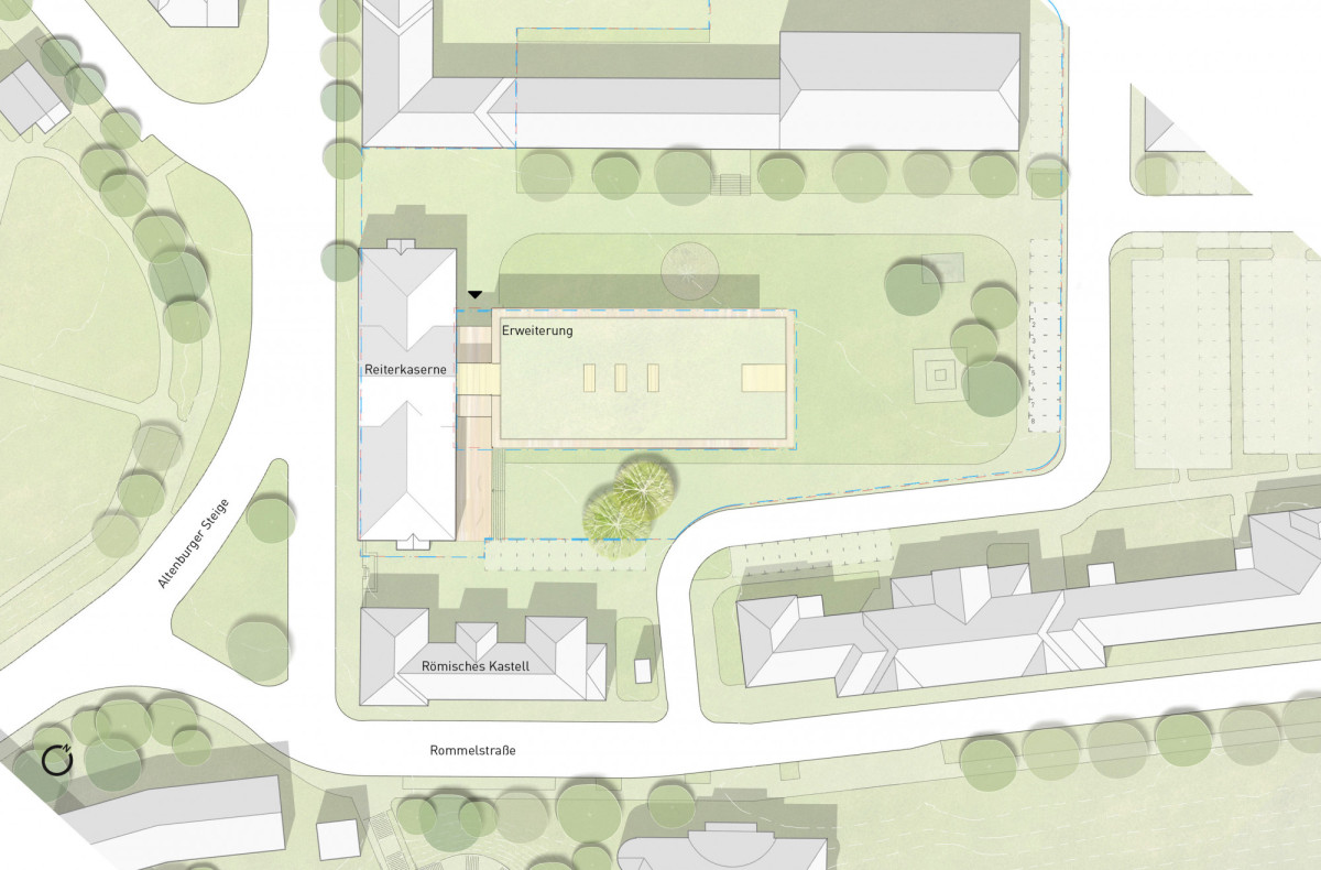 Die Erweiterung der Schulanlage wird so zu positioniert, dass das Bestandsgebäude baulich weiterhin eigenständig im Stadtraum verankert bleibt. Der Neubau erhält zum Bestandsgebäude einen Fugenabstand gleich dem ehemaligen Anbau, welcher abgerissen wird. An der „neuen, alten“ Fuge, zwischen Bestandsgebäude und Neubau wird ein offener gläserner barrierefreier Eingang mit Vorplatz, Windfang und Vordach zum Schulcampus etabliert. Das neue Gebäude bleibt niedrig und erhält eine Dachbegrünung, damit sich die Erweiterung in die Hofstruktur der Umgebung einpasst.