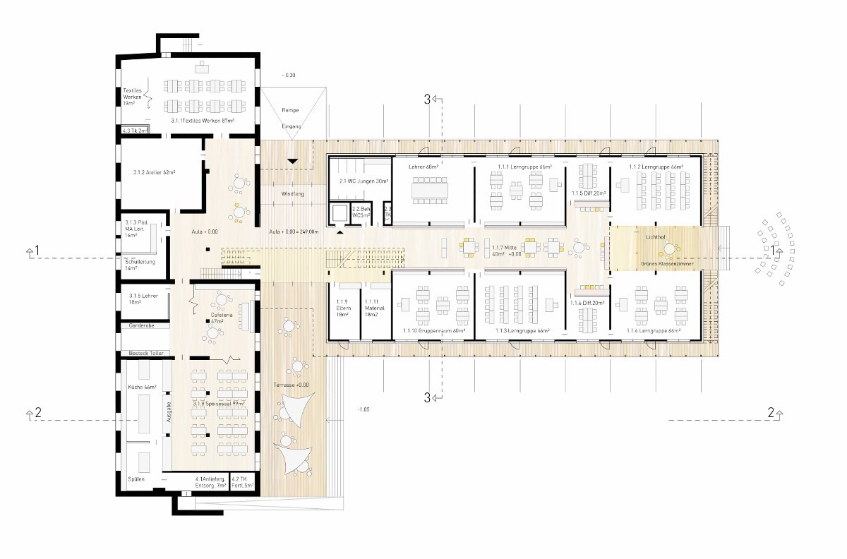 Die bestehende Reiterkaserne bleibt in ihrer inneren Struktur erhalten. Die nachträglich eingebauten leichten Trennwände werden entfernt. Alle Fachklassen werden im Altbau im Erdgeschoss und im 1. Obergeschoss untergebracht. Auch die Mensa mit Cafeteria mit großzügiger Terrasse befinden sich im Bestand. Alle neuen Lerngruppen werden im Sinne einer Lernwerkstatt im Erweiterungsbau untergebracht.