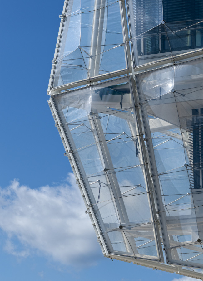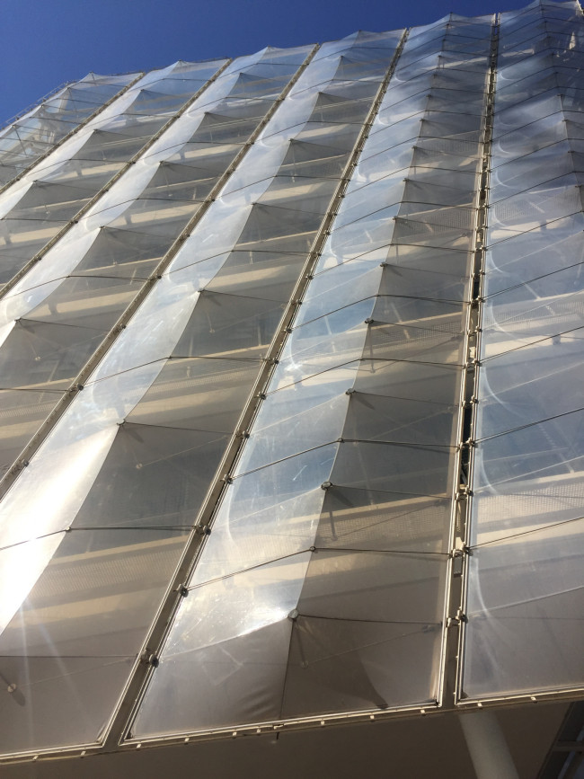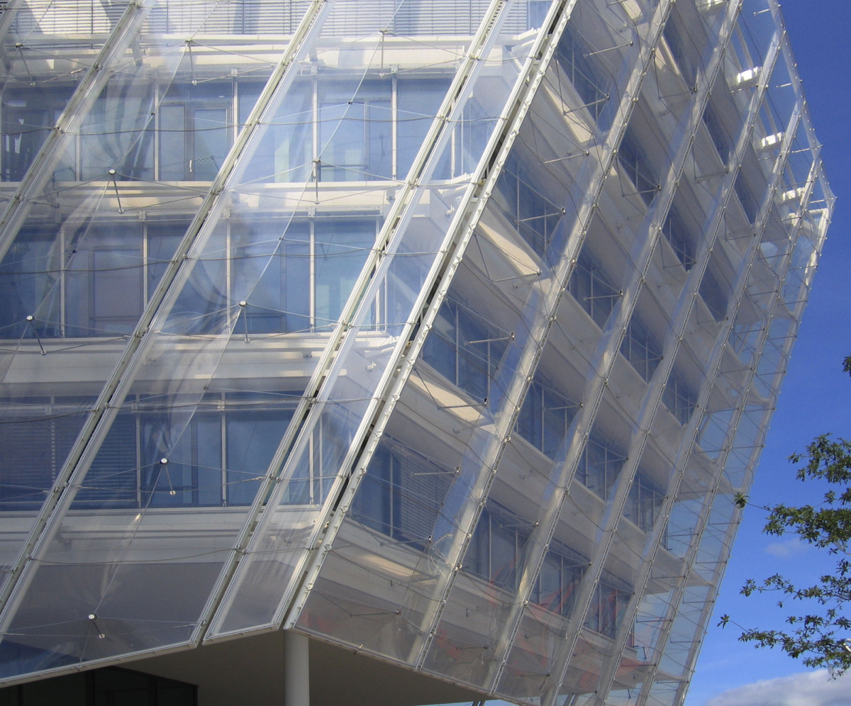 Eine aussenliegende, transparente Membran, verbindet funktionale mit architektonischen Gesichtspunkten. Der Schall- und Windschutz der äußeren Fassade ermöglicht eine natürliche Lüftung trotz der Schallbelastung durch den Straßenverkehr. Zusätzlich bietet die Membran, gleich einem Kastenfenster, einen Windschutz für den “aussenliegenden” Sonnenschutz. Dieser Windschutz ist aufgrund der windexponierten Lage essentiell für die Funktion des Sonnenschutzes und somit für einen Gebäudebetrieb ohne Klimaanlage. Ein zweigeteilter Sonnenschutz mit Lichtlenkfunktion im Oberlichtbereich ermöglicht auch bei direkter Besonnung eine blendfreie natürliche Belichtung. Das so eingespiegelte Sonnenlicht wird im Innern des Gebäudes über reflektierende Materialien an den Brüstungen in die Tiefe des Raums reflektiert.