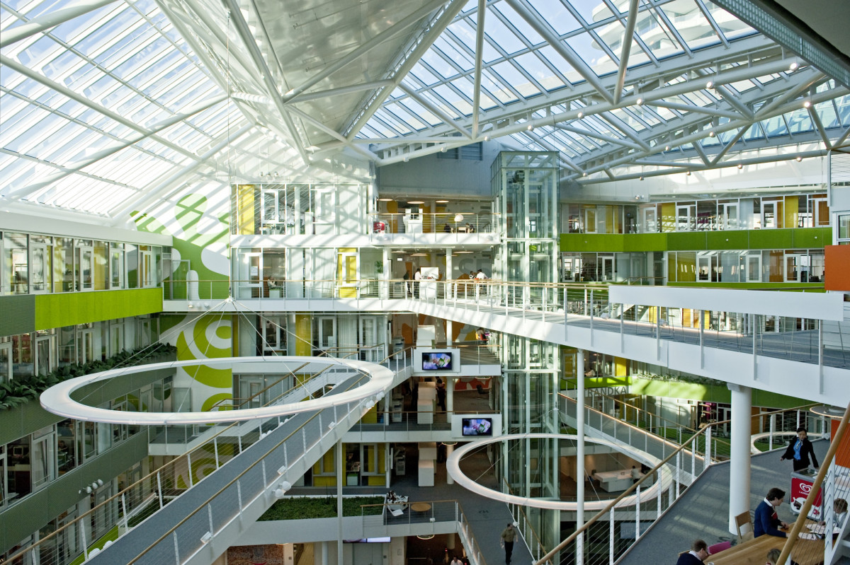 Ein komplex geformtes, lichtdurchflutetes Atrium mit großzügigen Flächen, Gärten und einem öffentlich zugänglichen Erdgeschoss bildet die Grundlage der räumlichen Entwicklung für die neue Konzernzentrale von Unilever. Die Arbeitsplätze sind alle natürlich belichtet. Eine Prismendecke unter dem Atriumdach filtert dabei das Licht nach unten und dient als Sonnenschutz und Blendschutz, ohne die Lichtmenge zu reduzieren.