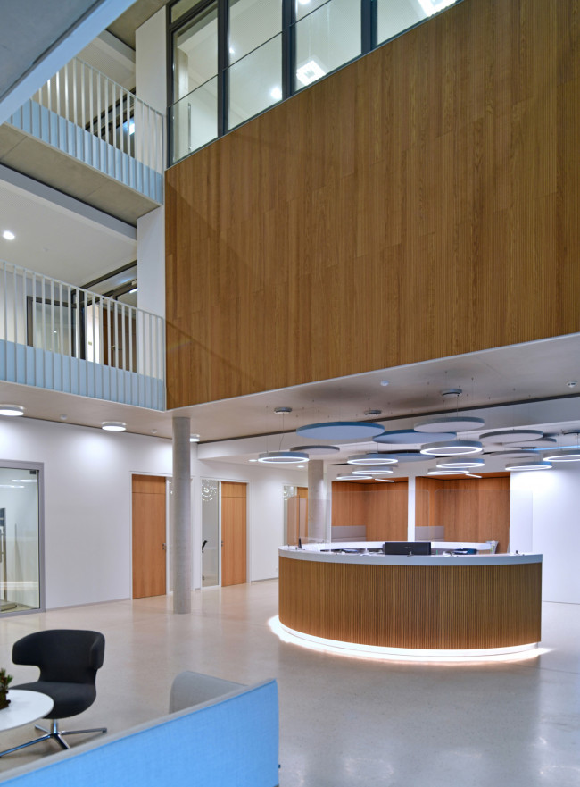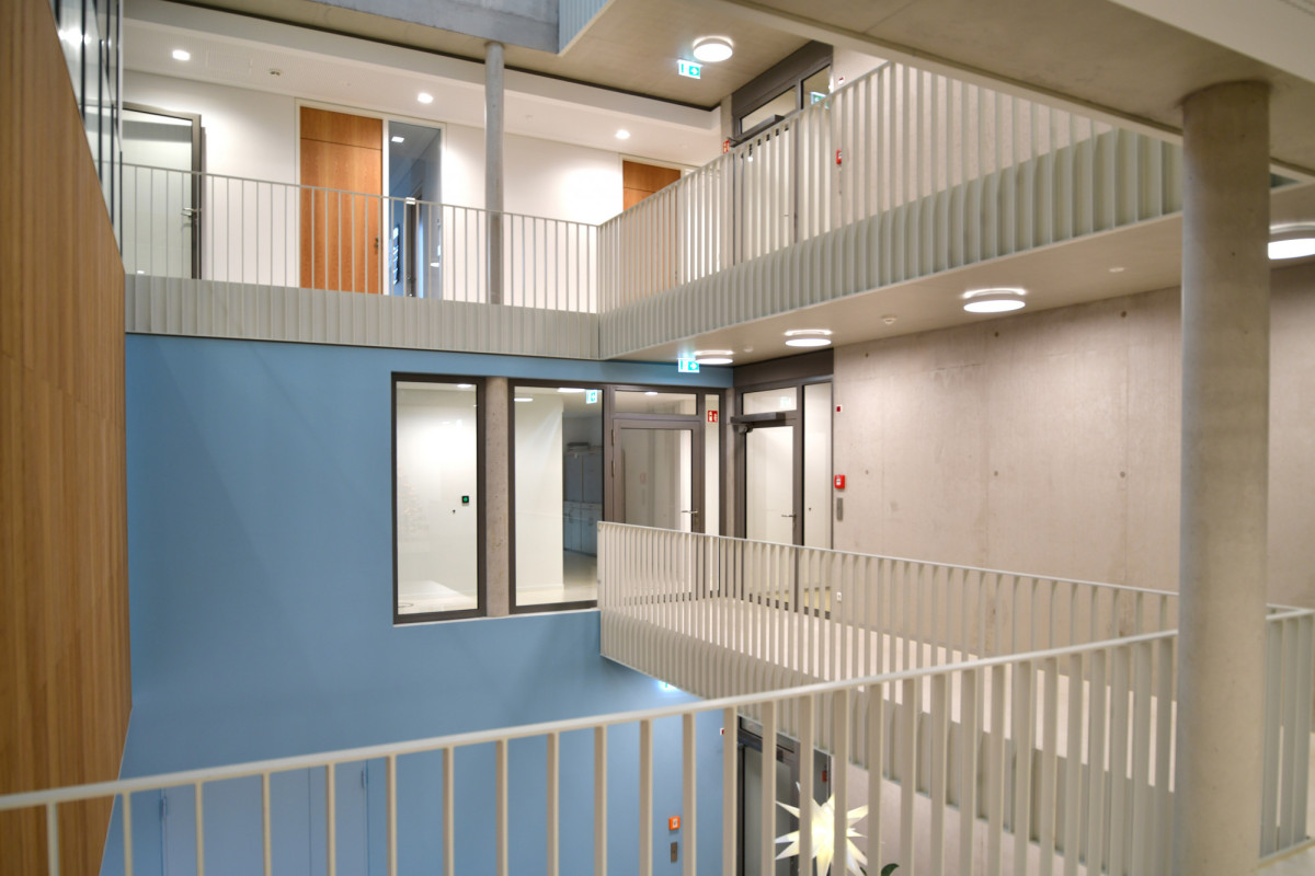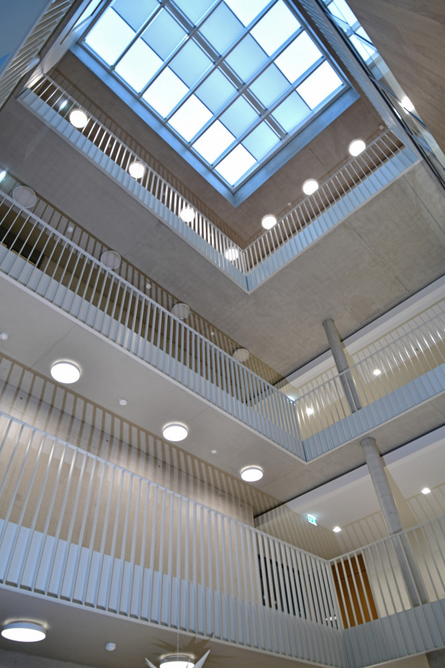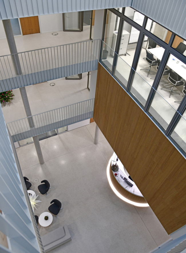 Blick ins Atrium, welches als Kristallisationspunkt sämtliche Geschosse miteinander verbindet und zur Belichtung und Belüftung beiträgt