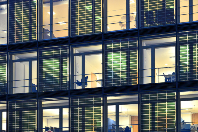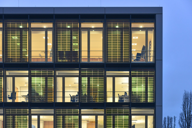 Das Schaufenster zur Straße visualisiert die Themen Energie und Nachhaltigkeit. Es werden stromproduzierende transluzente Glasmodule verwendet. Diese ermöglichen den Lichteinfall in das Gebäude und schaffen gleichzeitig eine geschützte Atmosphäre im Innenraum. Gestalterisch wird ein Wechselspiel zwischen Glasmodulen mit integrierter ASCA-Solarfolie und einer herkömmlichen Verglasung angewandt.