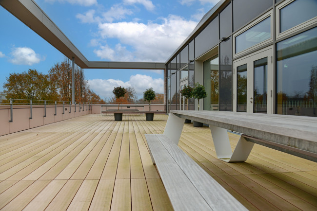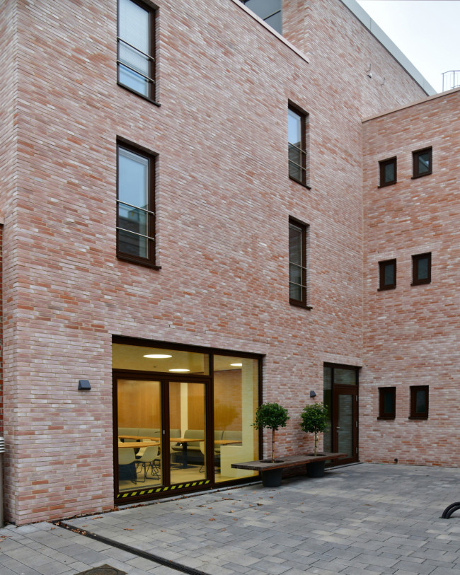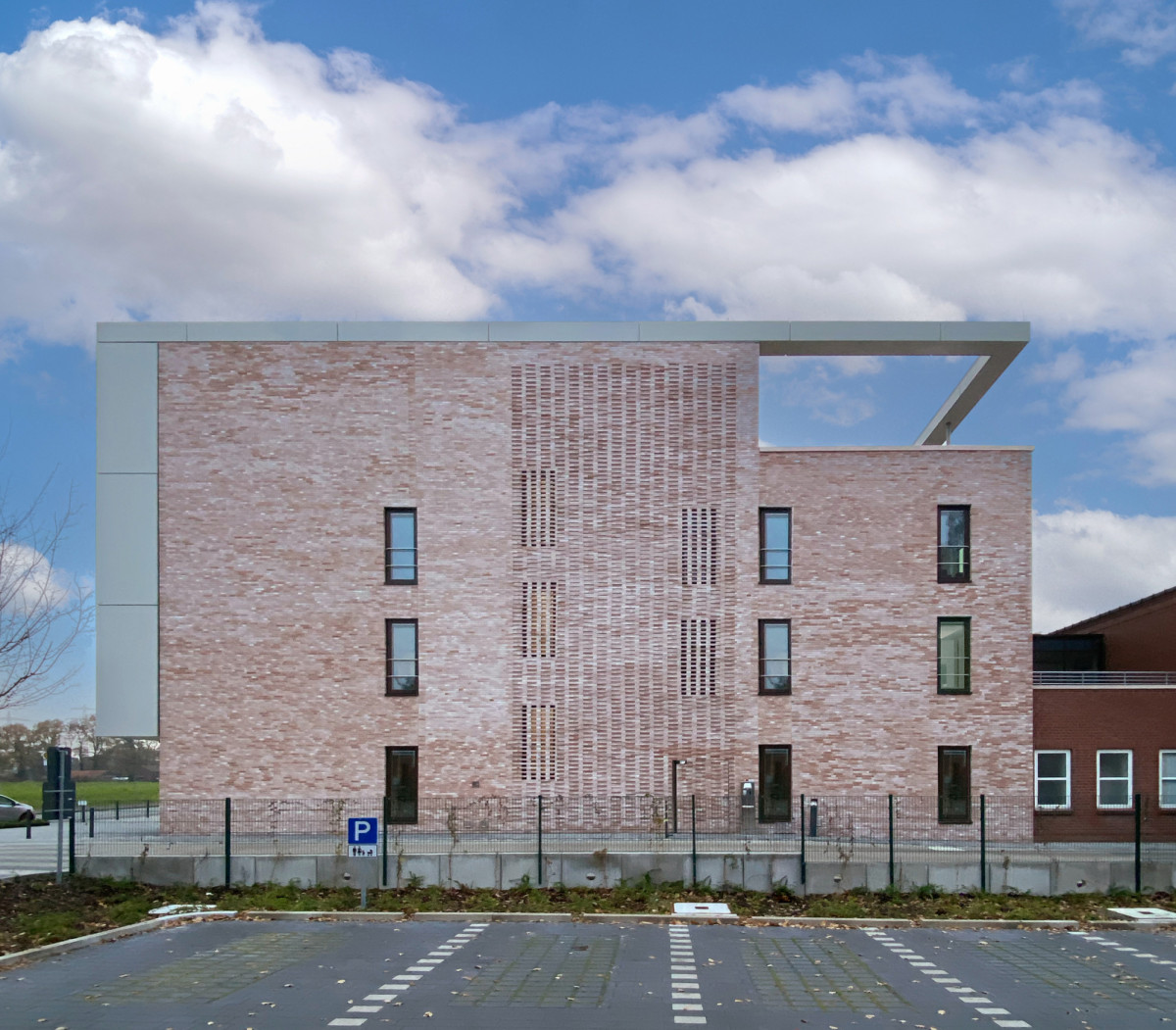 Südseitig entstand ein 4-geschossiger Baukörper, welcher durch seine Materialität eine horizontale Gliederung erfährt. Nordseitig ist ein Staffelgeschoß mit Dachterrasse entstanden, welches für spätere Erweiterungsmaßnahmen herangezogen werden kann. Das Dach des westlich gelegenen Bestandsgebäudes kann optional, zu einem späteren Zeitpunkt als Dachterrasse genutzt werden.
