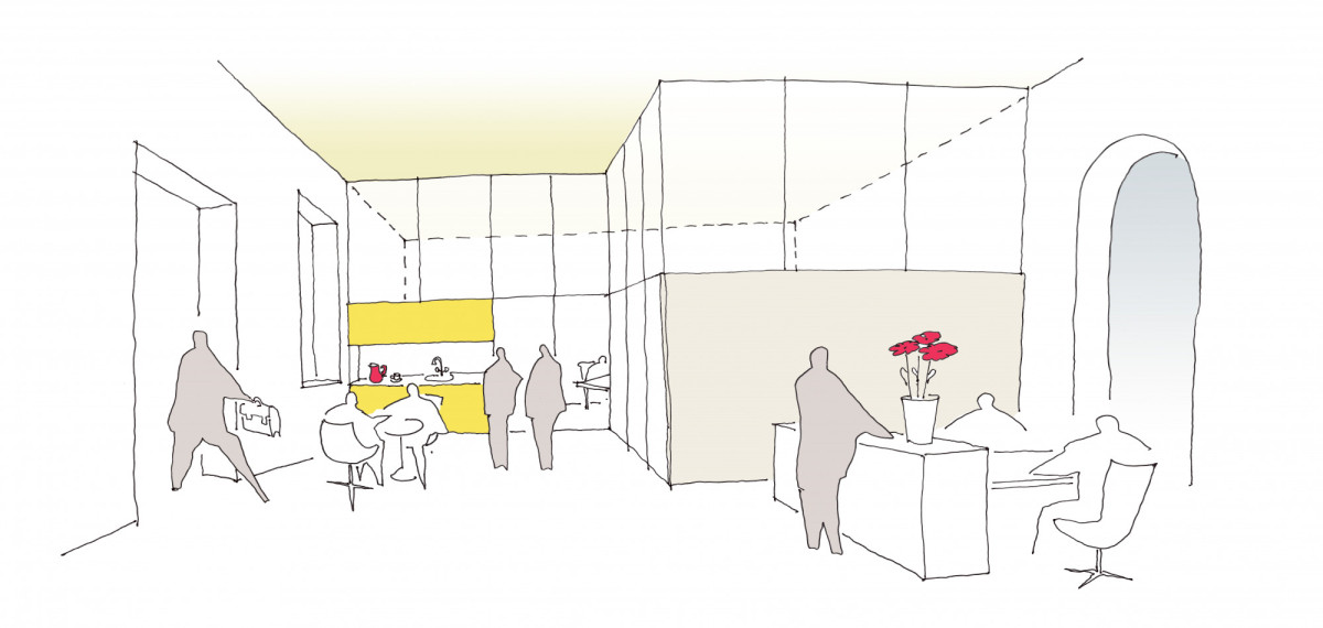 Im 1. Obergeschoss entsteht eine leistungsfähige Veranstaltungsfläche mit allen notwendigen Nebenräumen. Eine kleine Cateringküche mit einem Büro für das Veranstaltungsmanagement ergänzt die Nutzung. Die Veranstaltungsräume können entsprechend dem Nutzungsbedarf getrennt oder in Kombination genutzt werden. Es können mehrere Veranstaltungen parallel durchgeführt werden.