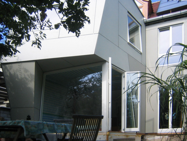 Ein bestehendes Reihenmittelhaus, in dem eine Familie mit drei Kindern wohnt, sollte auf einer Parzelle mit 5,50 m Breite, im Garten, Richtung Süden, erweitert werden. Im Erdgeschoss sollte der beengte Wohnraum vergrößert, im Obergeschoss ein zusätzliches Kinderzimmer gebaut werden.
