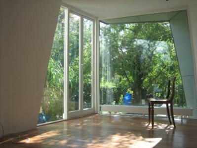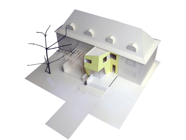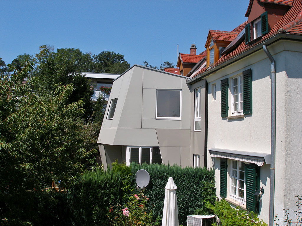 Der Anbau ist sehr klein, damit sich die Erweiterung im bestehenden Ensemble behaupten kann, wurde sie ihre Gestalt betreffend, dem Garten zugeschlagen. Kein Gebäude sollte entstehen, sondern gleich einem Gartenhaus ein Bewohner im Grünen, der sich an das bestehende Haus lehnt.