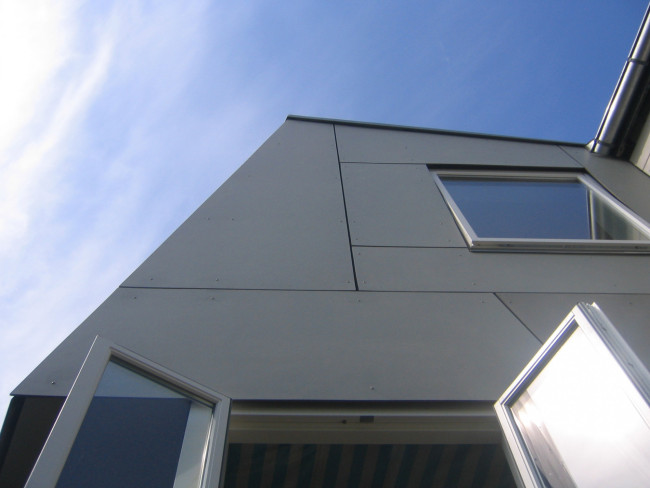 Im Erdgeschoss wurde der Wohnraum erweitert, wichtig war dabei die Zonierung der Bereiche Essen und Wohnen, wobei der Wohnbereich durch den Einsatz von großformatigen Glasfassaden als Gartenzimmer interpretiert wurde. Im Obergeschoss schiebt sich ein Kinderzimmer in die Baumkronen.