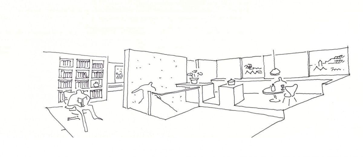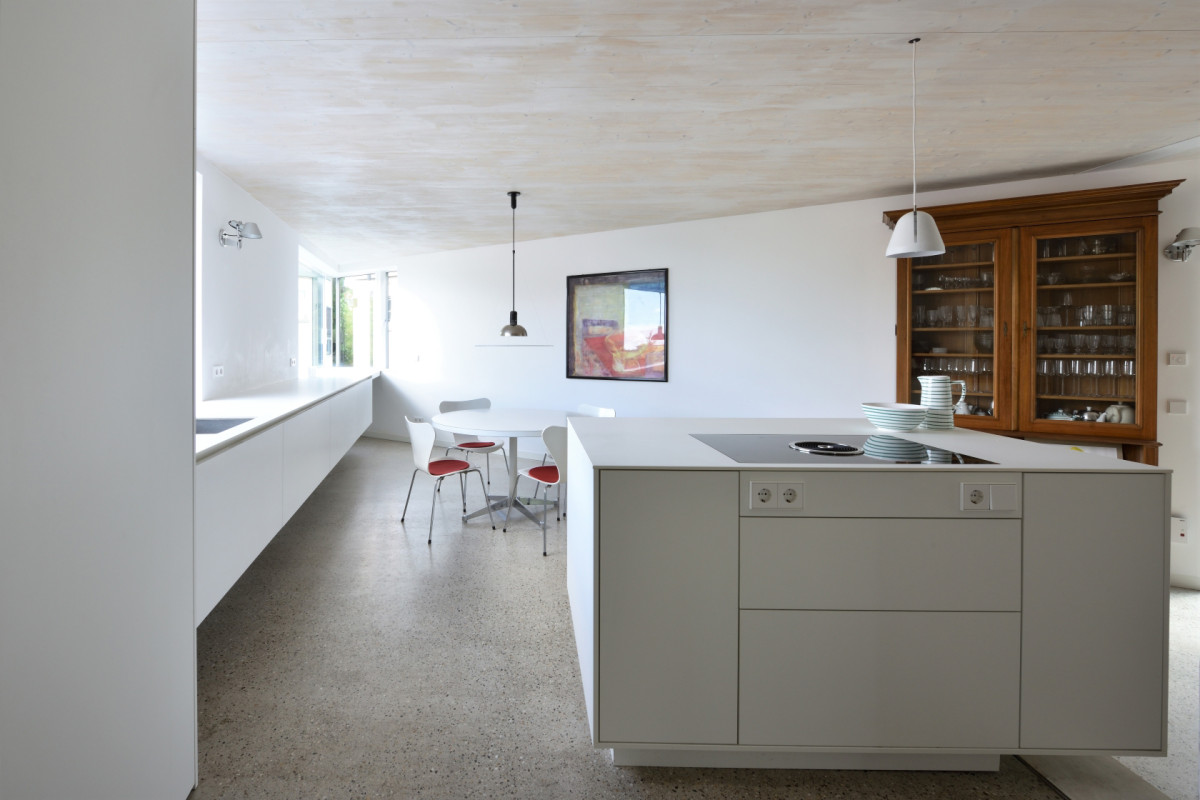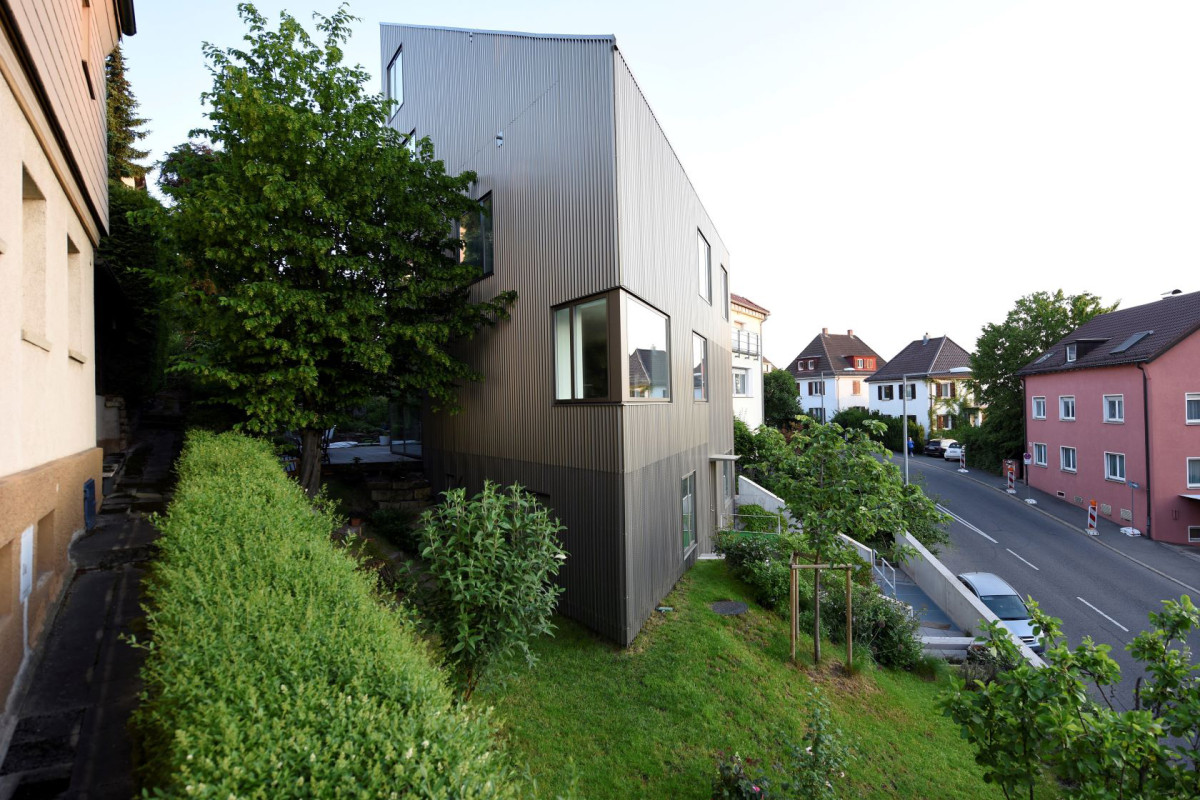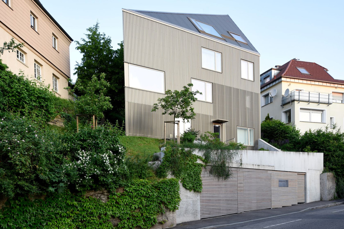 In das homogene Blechkleid wurden großzügige Fenster entsprechend der besonderen Blickrichtungen - zu den Weinbergen, das Neckartal, die Stadt - eingeschnitten. Die vielfältigen Ausblicksituationen definieren in den offenen Grundrissen besondere Aufenthaltssituationen. Helle Wandflächen, Einbaumöbel, der einheitliche Terrazzobelag und große Raumdiagonalen geben dem kleinen Haus im Innern die notwendige Großzügigkeit.