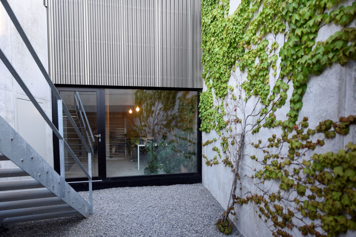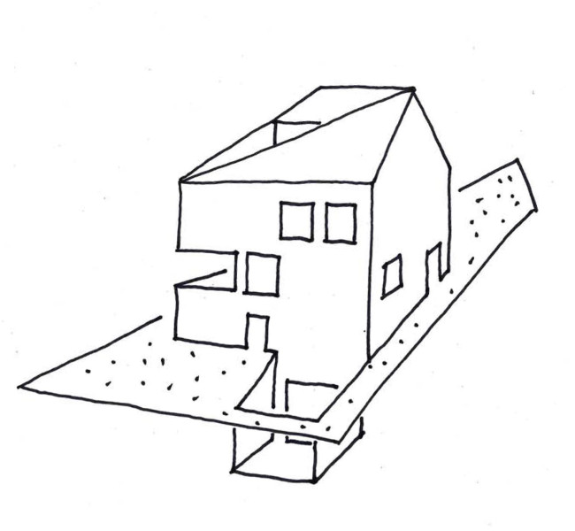 Das Haus nimmt das Trapez in seinem Grundriss auf. Ein kleiner Eingangshof auf dem Straßenniveau wird durch einen Atelierraum ergänzt. Eine Stahltreppe und ein Steg führen zu den Wohnungseingängen, die auf unterschiedlichen Hausseiten liegen und nur durch zwei kleine Vordächer markiert sind. Die unterschiedlichen Seitenlängen in der Hangsituation und die diagonale Firstlinie führen zu stark differenzierten Hausansichten.