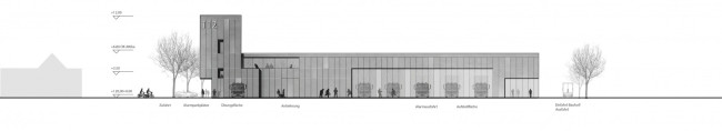 DRK und Bauhof bilden im östlichen Grundstück einen gemeinsamen Gebäuderiegel, parallel zur Alten Bundesstraße. Sie bilden hier den städtebaulich räumlichen Abschluss. Beide Nutzungen sind abschnittsweise getrennt. Gemeinsam ist die Fuge mit der barrierefreien Erschließung (Aufzug) und dem zweiten Rettungsweg.