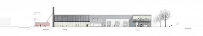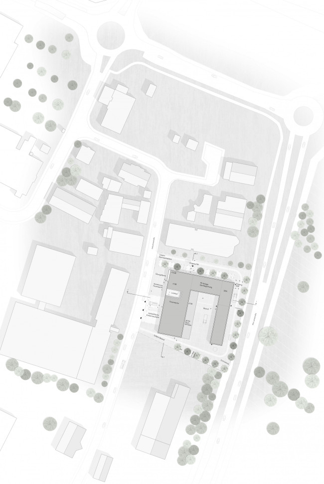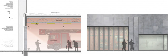 Die Feuerwehr erhält einen eigenständigen Baukörper, im westlichen Grundstücksbereich mit Orientierung und Adressbildung zur Industriestraße.