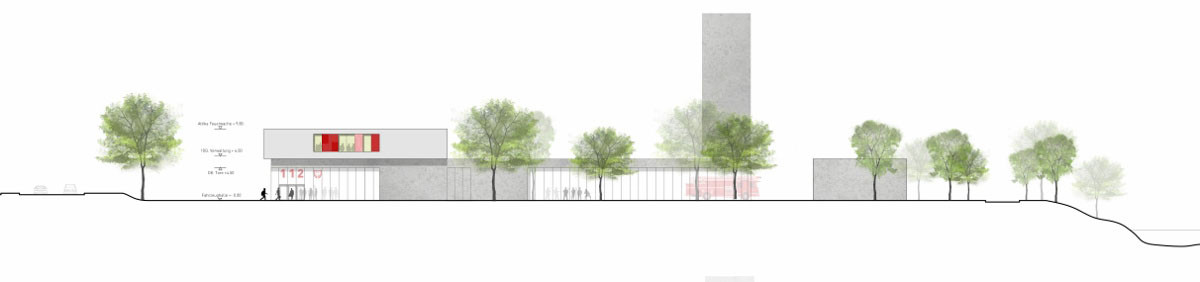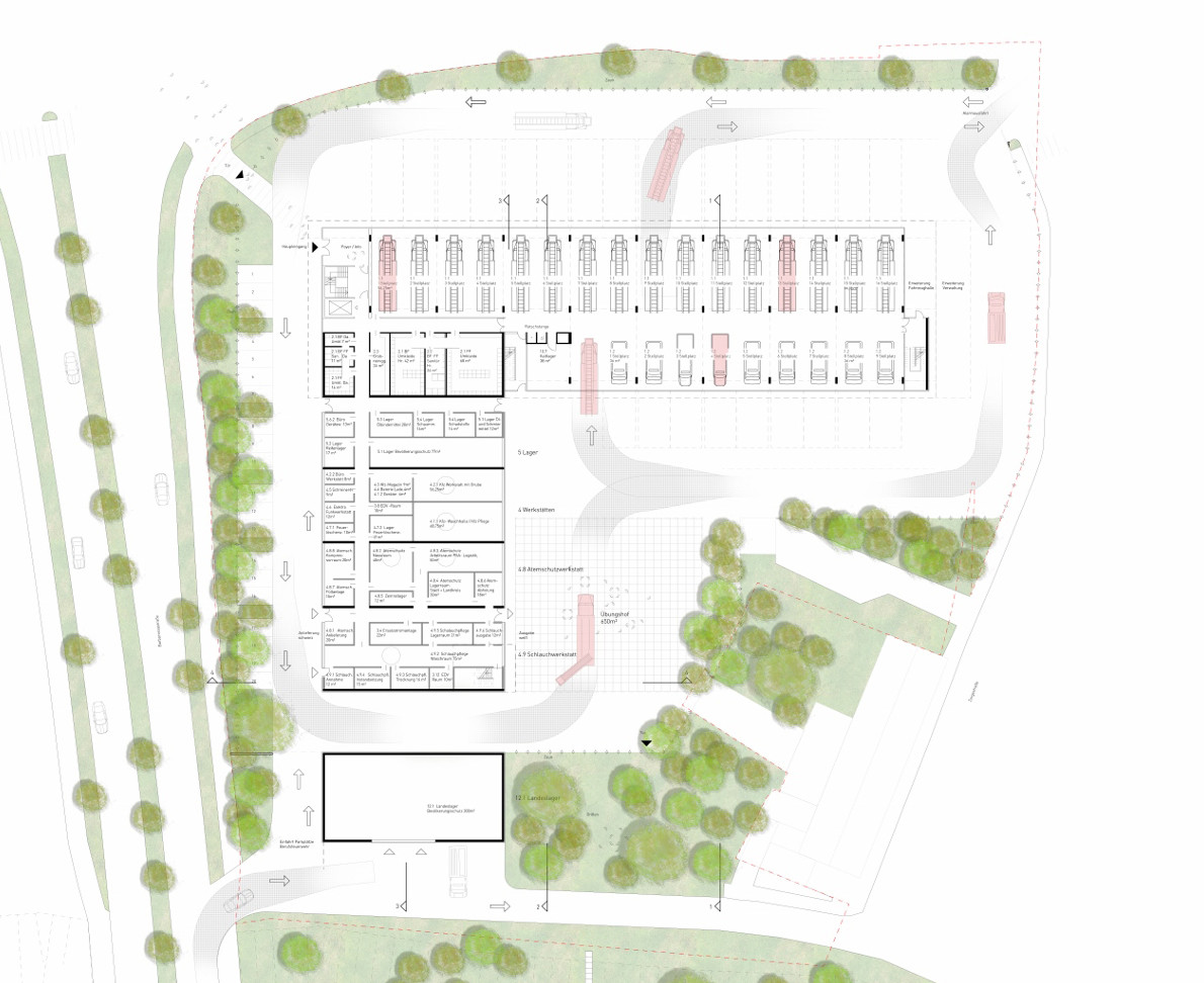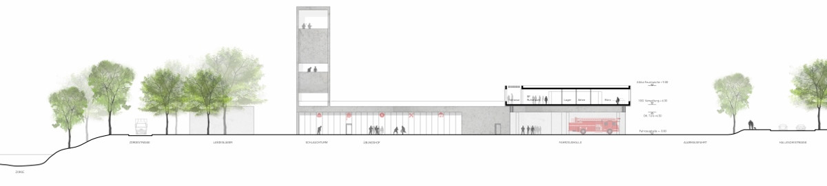 Die Anordnung des Obergeschosses steht für das Tragwerkskonzept der Fahrzeughalle eine besondere Herausforderung hinsichtlich Dimensionierung dar. Die Proportionierung und Materialisierung des Erscheinungsbildes entsprechen der Aufgaben stellung durch Transparenz sowie den Ausdruck von Leichtigkeit und Offenheit, insbesondere im Bereich der großflächigen Torfassaden der dem städtischen Raum zugewandten Fahrzeughalle. Die Lage des Schlauchturmes mit Übungshof ermöglicht eine konfliktfreie Nutzung. Positiv ist zu werten, dass das Landeslager separat erschlossen werden kann. Zur Nachhaltigkeit des Material-, Lüftungs- und Energiekonzeptes macht der Verfasser differenzierte, zielführende Vorschläge.