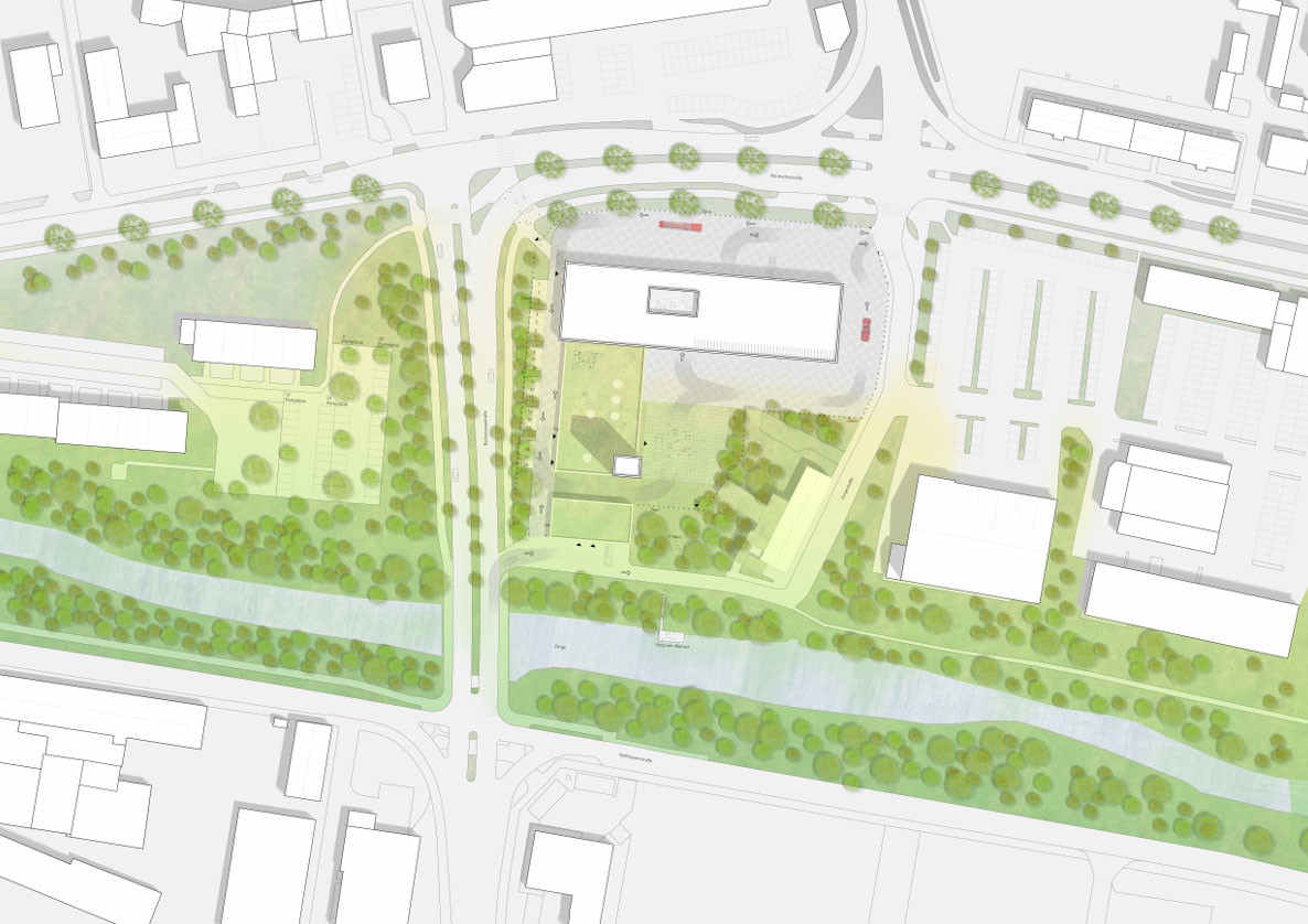 Den Verfassern gelingt durch die abgewinkelte Bauform mit den unterschiedlichen Gebäudehöhen eine den Bedeutungen der angrenzenden Strassenräurne angemessene städtebauliche Setzung. Die angehobene Geometrie des eigenständig wirkenden Obergeschosses stellt eine wirksame Geste in den städtischen Raum dar. Die Erschließung erfolgt konzentriert und nahe am Einfahrts-Kreuzungspunkt zur Halleschen Straße.