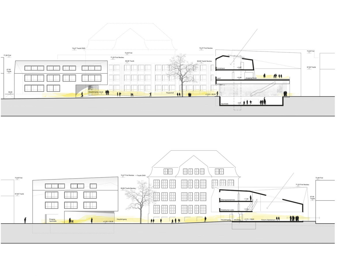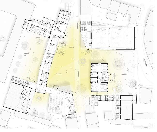 Das neue Forum und Aula mit Mensa und darüber liegendem Verwaltungs- und Lehrerbereich wird als künftiges Zentrum der Gesamtschule, südwestlich der Jüdefelderstraße platziert. Sie dient als Kristallisationspunkt zwischen Besuchern und Nutzern, sie ist als ein zusätzlicher städtischer Platz zu betrachten, welcher durch Weiterführung der Außenfläche in das Gebäude, selbstverständlich als Verteiler und Anlaufstelle fungiert. Die Sekundarstufe 2 und die Sporthalle ergänzen das 3-geschossige Wohnquartier im nördlichen Bereich. Die Baukörper und deren Fassaden zitieren so die Körnung der vorhandenen Baustruktur.