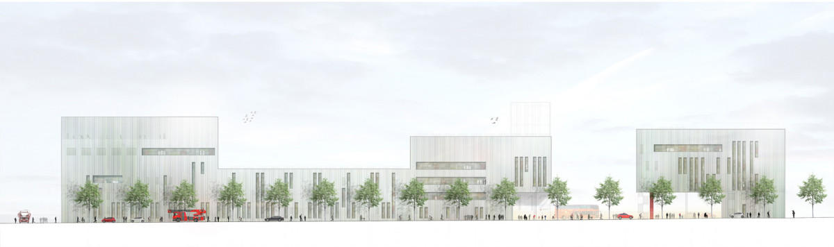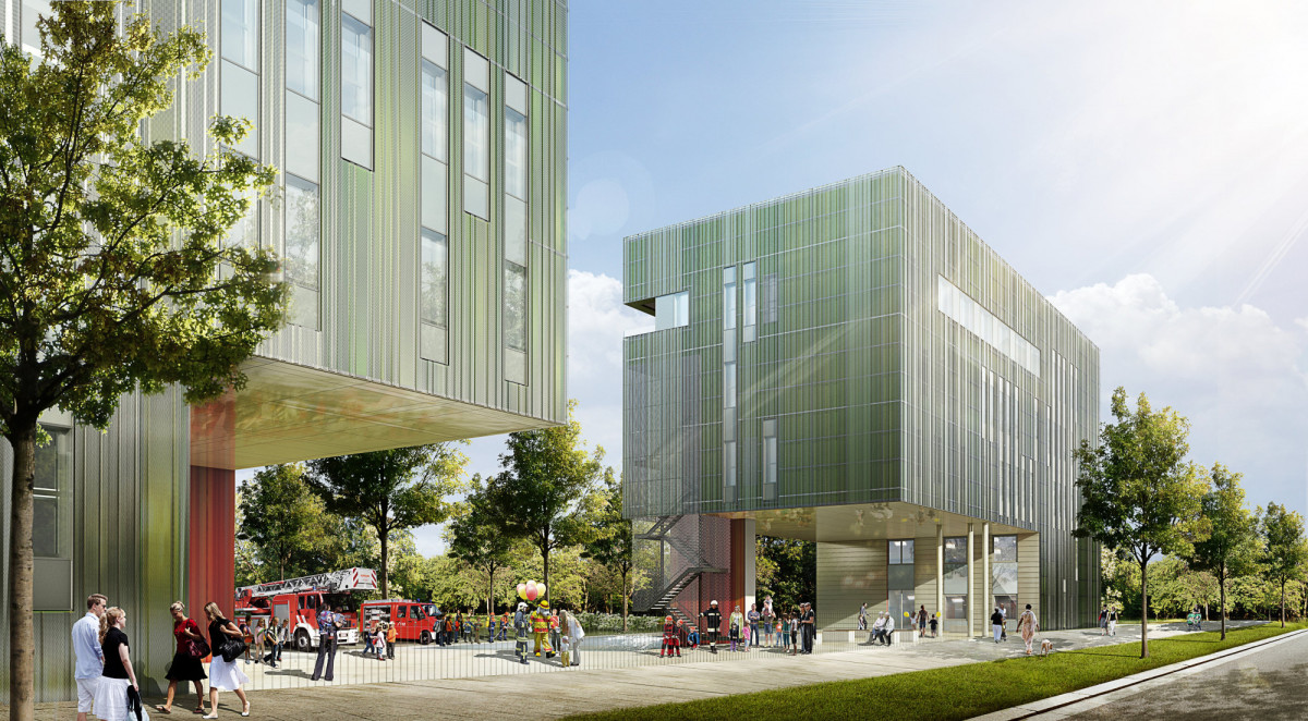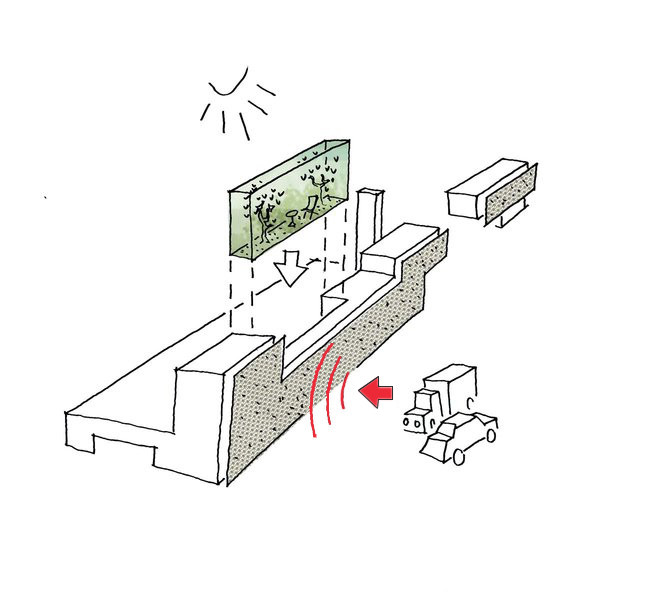 Aus dem begrünten Wall, entlang der Bahntrasse, bilden sich Grünzungen heraus. Im Bereich des Gewerbe- und Dienstleistungsgebietes sowie der Feuerwache werden die Grünzungen baulich als ein- bis zweigeschossige, begrünte Sockel ausgebildet. Diese bieten im Norden Dienstleistungen an, im Süden sind sie mit Parkgeschossen belegt. Die große Halle der Feuerwache bildet den begrünten Sockel unter dem Riegel der Wache.