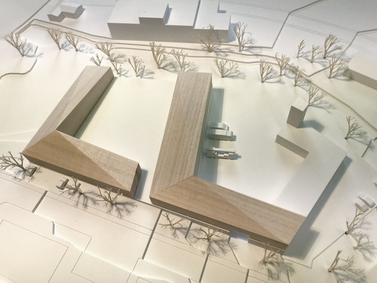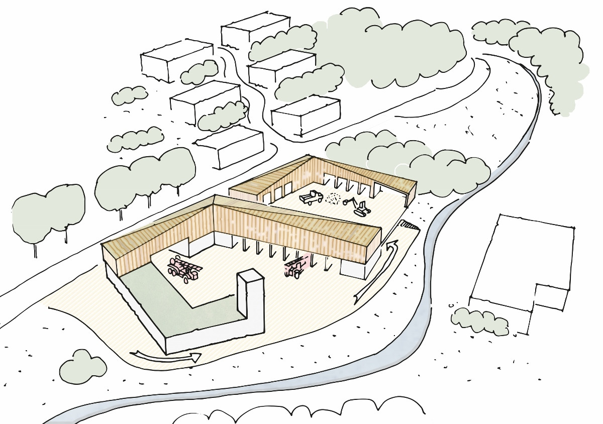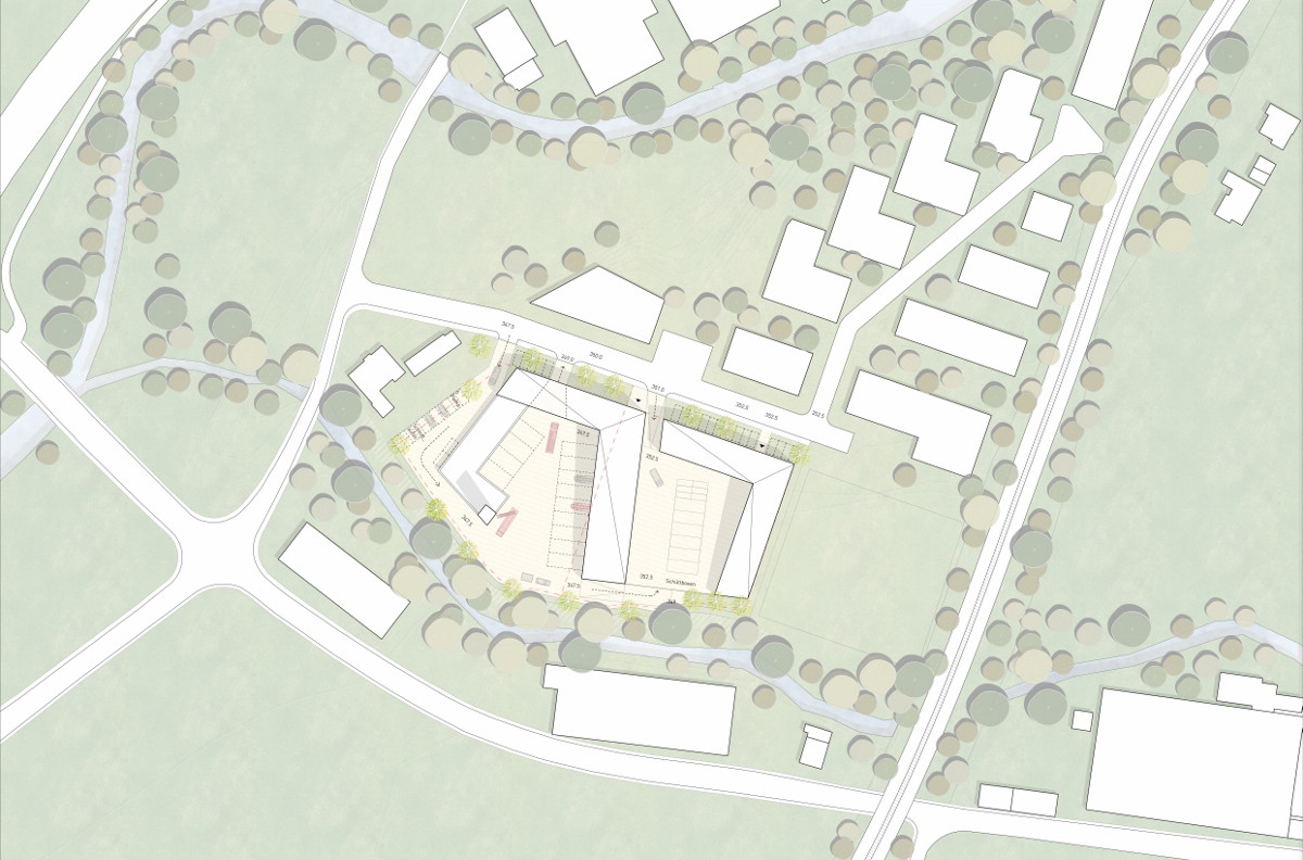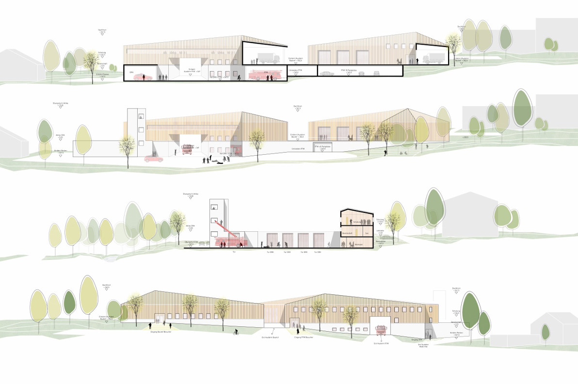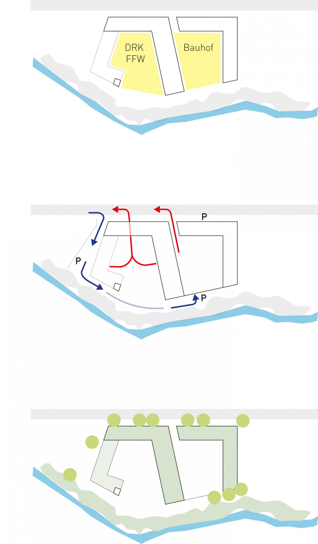 Wie landwirtschaftliche Gehöfte liegen die Gebäude mit massivem Sockel und hölzernen Riegelbauten in der Topografie und reagieren auf das von Ost nach West abfallende Grundstück. Westlich befindet sich das DRK, mittig die FFW und östlich der Bauhof. Alarmausfahrt und Zufahrt zu den PKW- Parkplätzen erfolgen getrennt und kreuzungsfrei. Westlich der neuen Erschließungsstraße befindet sich die PKW Zufahrt. Mittig die Ausfahrt der Feuerwehr und der Rettungswache. Östlich die Ein- und Ausfahrt des Bauhofes. Das ansteigende Gelände wird in 2 Ebenen aufgeteilt. Auf der unteren Ebene +347,5 befinden sich das DRK und die FFW. Auf der oberen Ebene + 352,5 liegt der Bauhof.