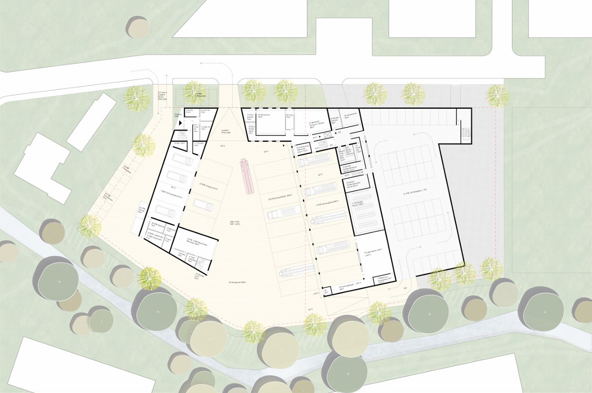 Durch die Schichtung der Nutzungseinheiten können für die jeweiligen Bereiche großzügige Freiflächen geschaffen werden. Lager und Werkstatträume sind ebenengleich mit den Fahrzeughallen angeordnet.