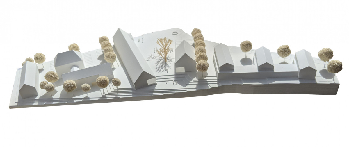 Das Gästehaus wird als zweigeschossiger Solitär mit räumlicher Beziehung zur Gastronomie vorgeschlagen. Im Erdgeschoss könnte sich der hohe Frühstücksraum zum Platz öffnen. Als Raum am Platz könnte er aber auch für andere Veranstaltungen flexibel genutzt werden. Die meisten Zimmer orientieren sich nach Südwesten und liegen zum Gelände etwas erhöht, damit die Gäste nicht gestört werden.