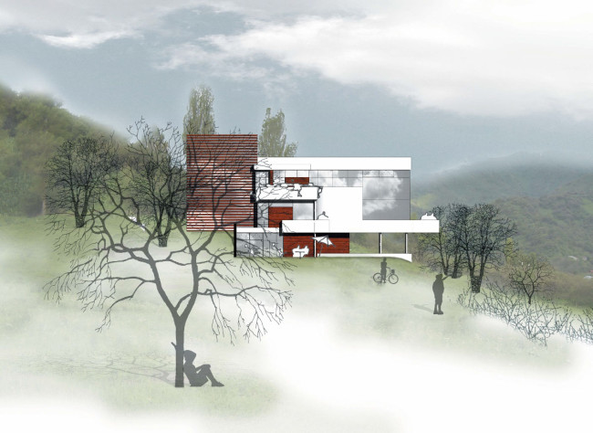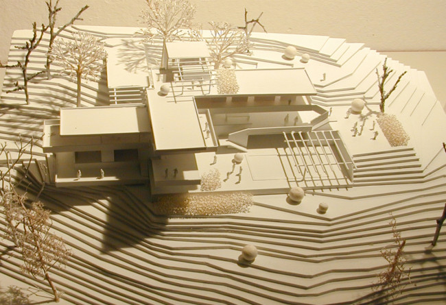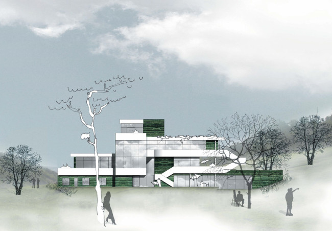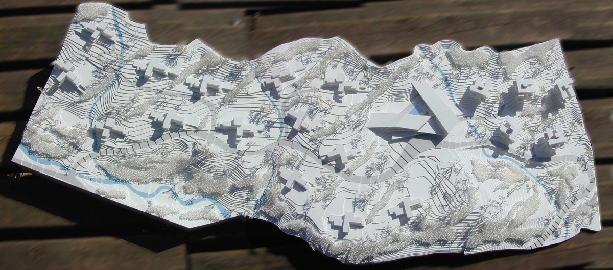 Das Baugrundstück ist aufgrund seiner Art und Lage ruhig und stark durchgrünt, aber vor allem aufgrund der attraktiven und charakteristischen Hangsituation geradezu prädestiniert, verschiedene Haustypen zu entwickeln und daraus ihre Architektur und ihre Qualität abzuleiten. Diese tendenziell landschaftlichen Qualitäten werden erhalten und gestärkt. Besondere Berücksichtigung findet hierbei die Tatsache, dass es ich um einen Nordhang handelt. Charakterisiert wird das neue Wohngebiet durch das Gästehaus. Wie selbstverständlich schmiegt sich es an der prägnantesten Stelle des Planungsgebietes in eine Geländemulde und verschmilzt mit dieser teilweise, bzw. überhöht diese durch klar formulierte und baulich ausgeformte Geländeverschnitte. So wird erreicht, dass sich die sehr große Baumasse gegenüber der Wohnbebauung zurücknimmt und gleichzeitig an geeigneter Stelle Zeichen setzt.