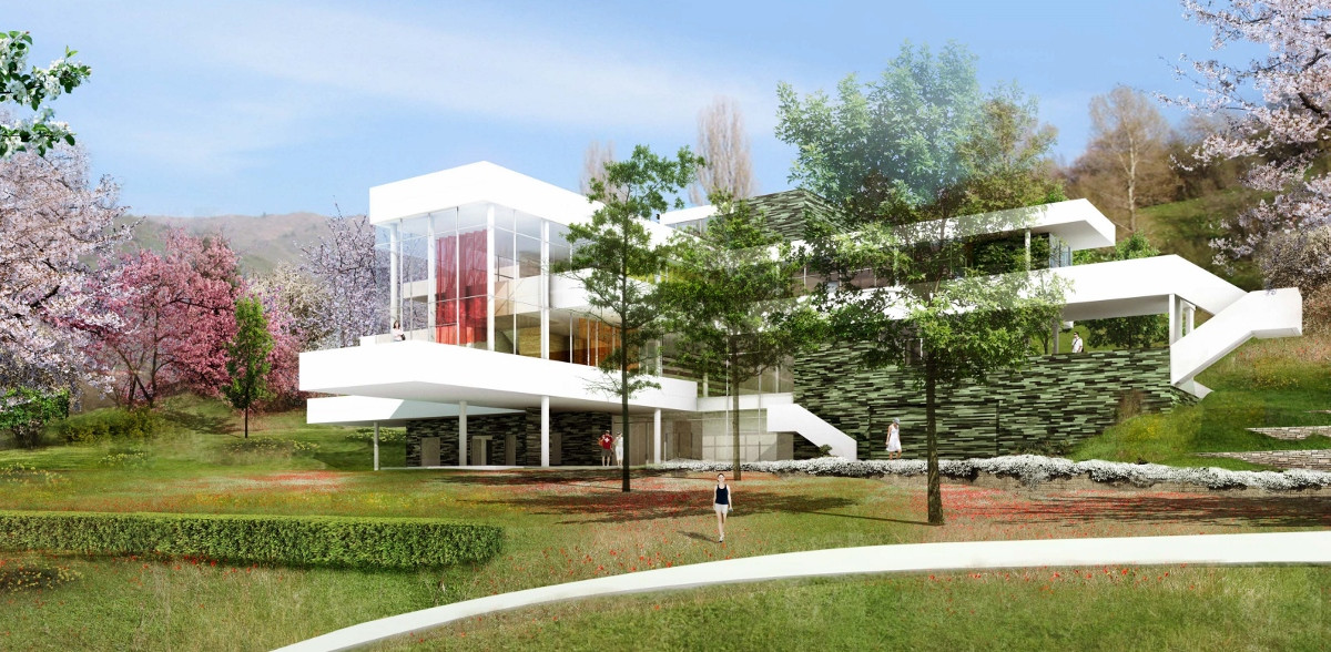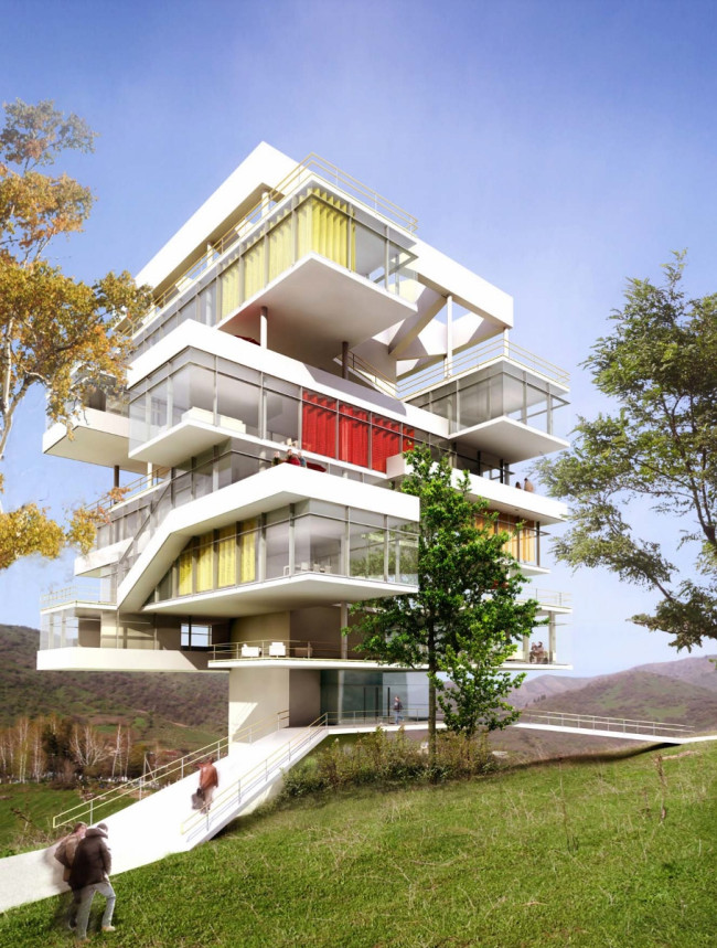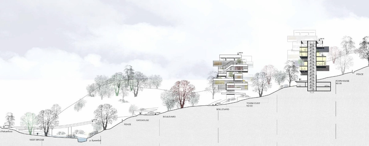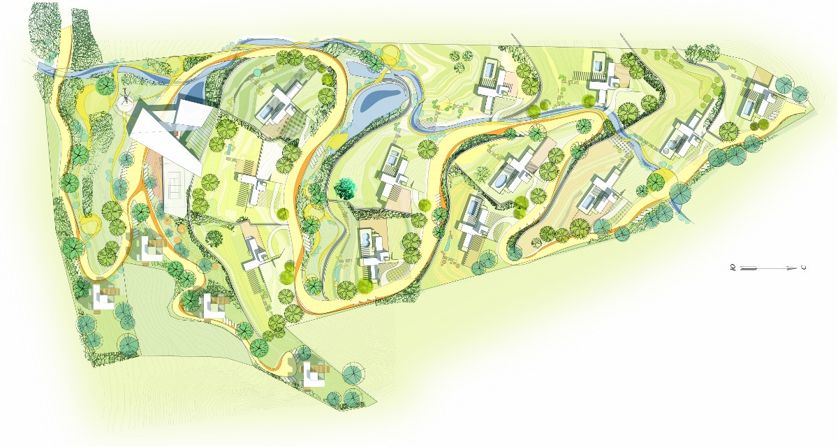 Östlich des Gästehauses ist die aufgelockerte Bebauung der Villen vorgesehen und zwar derart, dass die „Häuser“ im Grünen liegen und von Grün umgeben sind. Das Grün sollte die Anlage durchdringen. Auch sollte die Anordnung der Baumassen derart sein, dass Durchblicke von den jeweiligen Wohnsituationen ins Tal, oder umgekehrt, auf die Hänge, gegeben sind.