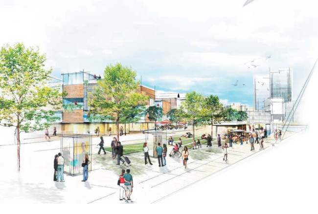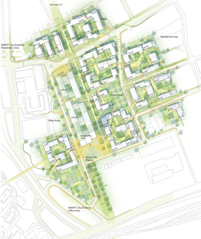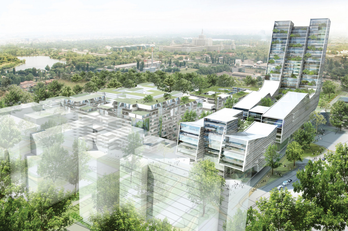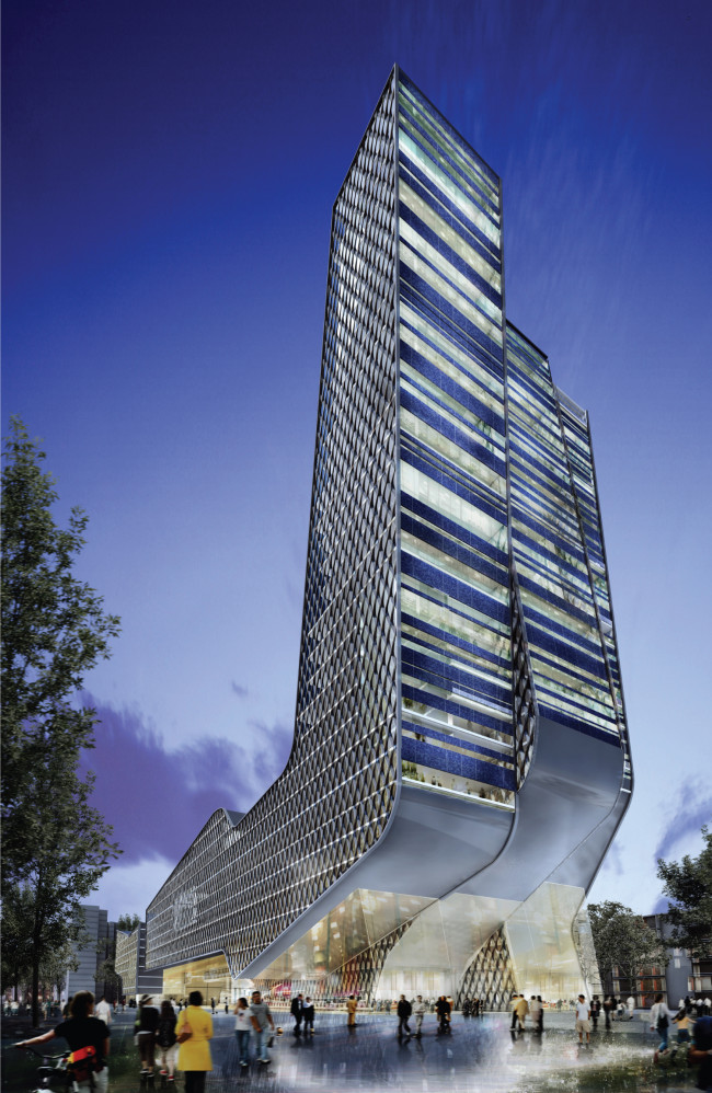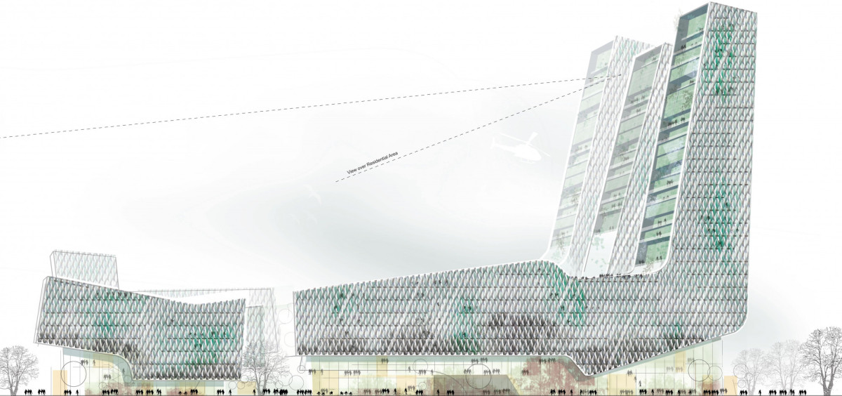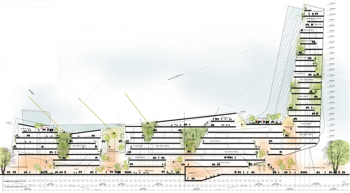 Der Büroturm erhebt sich von Norden nach Süden in stetiger Bewegung in die Vertikale. Verbunden wird der Büroturm und dessen Basis, mit dem sich im Osten befindlichen Wohnquartier durch einen Boulevard, der die unterschiedlichen Entwicklungen auf dem Grundstück zusammenfasst. So entsteht eine offene, urbane und öffentliche Magistrale, die sowohl als Kommunikationsraum als auch als identitätsstiftender Freibereich das städtische Leben prägt.