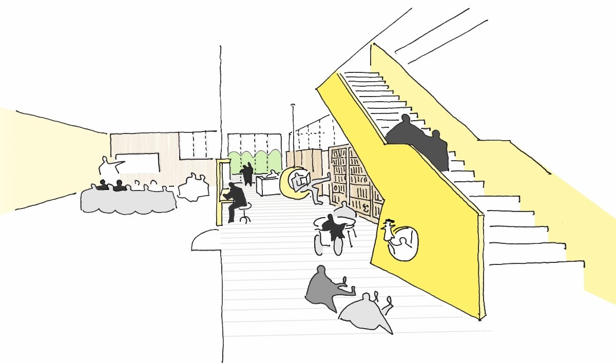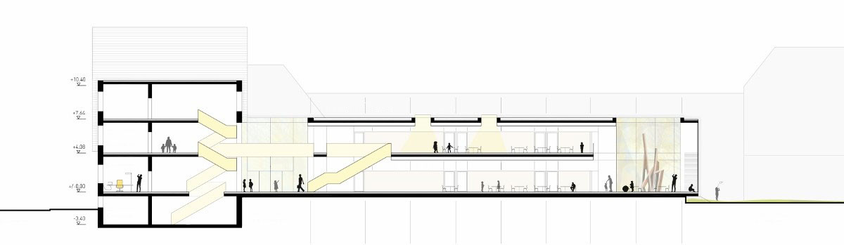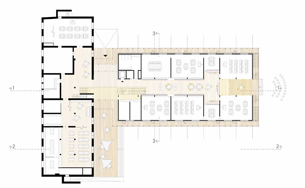 Der Erweiterungsbau soll sich wie eine Laube in die kräftige, denkmalgeschützte Randbebauung einfügen. Er zeigt sich vorwiegend in Holzbauweise. Die Fluchtbalkone sind nicht nur Fluchtbalkone, sondern bilden die zweite Schicht der neuen Lernlandschaft. Sie wirken wie ein Schutzraum und Filter. Die Fluchtbalkone bestehen aus leichten Materialien und Strukturen aus Holz und Metall.