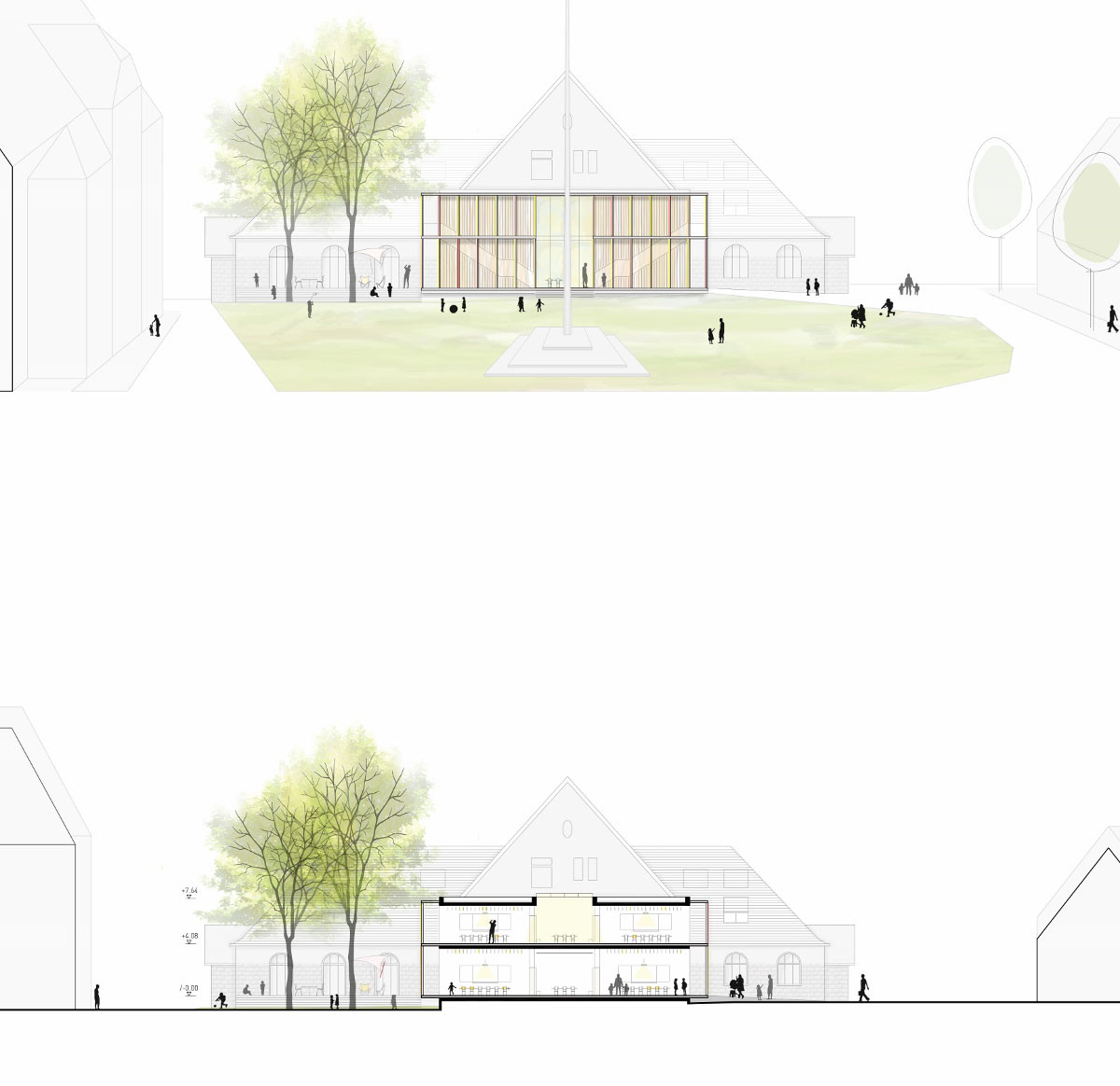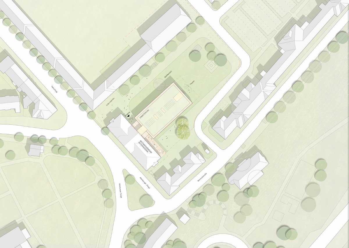 Vorgeschlagen wird, die Erweiterung der Schulanlage so zu positionieren, dass das Bestandsgebäude baulich weiterhin eigenständig im Stadtraum verankert bleibt. Der Neubau erhält zum Bestandsgebäude einen Fugenabstand gleich dem ehemaligen Anbau, welcher abgerissen wird. An der „neuen, alten“ Fuge, zwischen Bestandsgebäude und Neubau wird ein offener gläserner barrierefreier Eingang mit Vorplatz, Windfang und Vordach zum Schulcampus etabliert. Der Neubau wurde in seiner Länge soweit wie möglich reduziert, um verträgliche Proportionen im städtebaulichen Gefüge zu erhalten. Das neue Gebäude bleibt niedrig und erhält eine Dachbegrünung, damit sich die Erweiterung in die Hofstruktur der Umgebung einpasst.